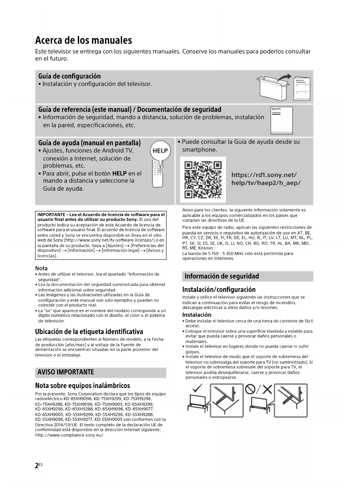 - Antes de utilizar el televisor, lea el apartado “Información de seguridad”.• Lea la documentación del seguridad suministrada para obtener información adicional sobre seguridad.• Las imágenes y las ilustraciones utilizadas en la Guía de configuración y este manual son solo ejemplos y pueden no coincidir con el producto real.• La “xx” que aparece en el nombre del modelo corresponde a un dígito numérico relacionado con el diseño, el color o el sistema de televisión. Ubicación de la etiqueta identificativa Las etiquetas correspondientes al Número de modelo, a la Fecha de producción (año/mes) y al voltaje de la Fuente de alimentación se encuentran situadas en la parte posterior del televisor o el embalaje. AVISO IMPORTANTE Nota sobre equipos inalámbricos Por la presente, Sony Corporation declara que los tipos de equipo radioeléctrico KD-85XH9096, KD-75XH9299, KD-75XH9296, KD-75XH9288, KD-75XH9096, KD-75XH9005, KD-65XH9299, KD-65XH9296, KD-65XH9288, KD-65XH9096, KD-65XH9077, KD-65XH9005, KD-55XH9299, KD-55XH9296, KD-55XH9288, KD-55XH9096, KD-55XH9077, KD-55XH9005 son conformes con la Directiva 2014/53/UE. El texto completo de la declaración UE de conformidad está disponible en la dirección Internet siguiente: http://www.compliance.sony.eu/Aviso para los clientes: la siguiente información solamente es aplicable a los equipos comercializados en los países que cumplan las directivas de la UE.Para este equipo de radio, aplican las siguientes restricciones de puesta en servicio o requisitos de autorización de uso en AT, BE, HR, CY, CZ, DK, EE, FI, FR, DE, EL, HU, IE, IT, LV, LT, LU, MT, NL, PL, PT, SK, SI, ES, SE, UK, IS, LI, NO, CH, BG, RO, TR, AL, BA, MK, MD, RS, ME, Kosovo :La banda de 5 150 - 5 350 MHz solo está permitida para operaciones en interiores. Información de seguridad Instalación/configuración Instale y utilice el televisor siguiendo las instrucciones que se indican a continuación para evitar el riesgo de incendios, descargas eléctricas u otros daños y/o lesiones. Instalación