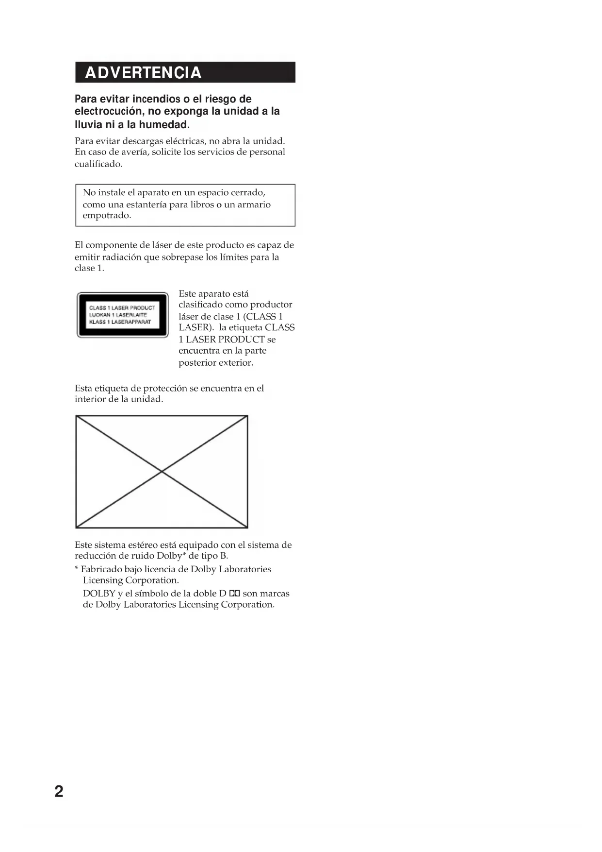 ADVERTENCIA Para evitar incendios o el riesgo de electrocución, no exponga la unidad a la lluvia ni a la humedad. Para evitar descargas eléctricas, no abra la unidad. En caso de avería, solicite los servicios de personal cualificado. No instale el aparato en un espacio cerrado, como una estantería para libros o un armario empotrado. El componente de láser de este producto es capaz de emitir radiación que sobrepase los límites para la clase 1. Este aparato está clasificado como productor láser de clase 1 (CLASS 1 LASER). la etiqueta CLASS 1 LASER PRODUCT se encuentra en la parte posterior exterior. Esta etiqueta de protección se encuentra en el interior de la unidad. Este sistema estéreo está equipado con el sistema de reducción de ruido Dolby* de tipo B.