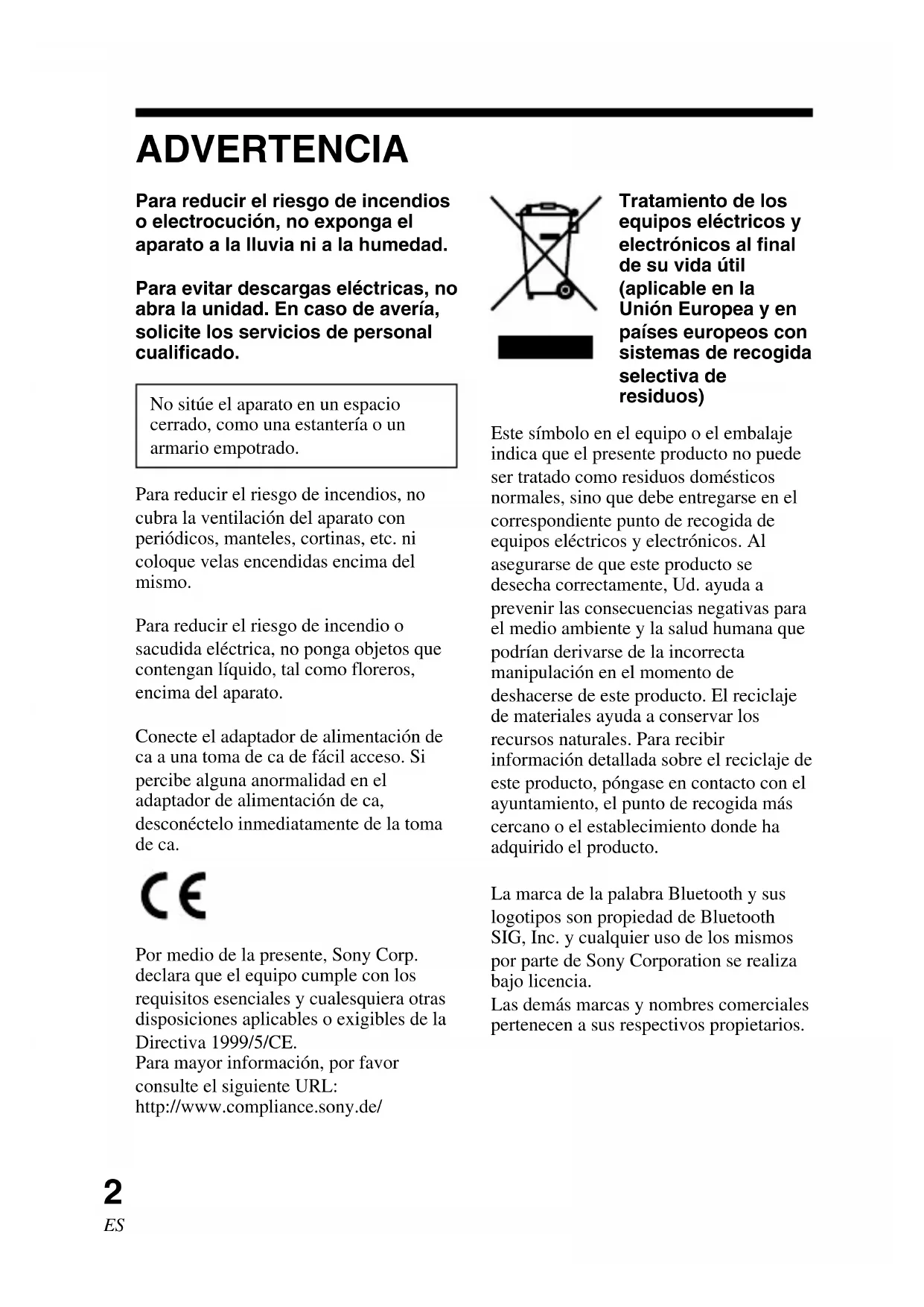 | Mantenimiento y reparación | No requiere mantenimiento, pero en caso de problemas, consulte el servicio postventa de SONY. |
