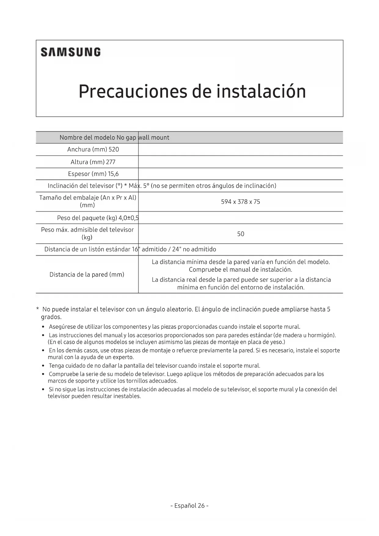 - Para mantener las prestaciones del producto y prevenir un mal funcionamiento, no lo instale en los lugares siguientes. – Lugares con riesgo de vibraciones o golpes: El producto podría caer y resultar dañado. – Cerca de un sensor de rociado: El sensor podría detectar el calor del televisor y poner en marcha los rociadores. – Cerca de cables de alto voltaje: El televisor podría sufrir la interferencia del cable de alto voltaje y la pantalla no se visualizaría correctamente. – Cerca de radiadores: El televisor podría sobrecalentarse y funcionar mal. – No lo instale en ningún lugar distinto de una pared vertical. – Instálelo fuera del alcance de los niños. – No rebaje la pared para instalarlo dentro. – Asegúrese de comprobar el tipo y estado de la pared donde hará la instalación. – Los materiales usados pueden variar según el tipo de pared. Elija los materiales de acuerdo con las especicaciones siguientes. – No es necesario utilizar todos los tornillos incluidos. No obstante, tiene que usar como mínimo 4 tornillos. – Debe utilizar tornillos en los dos lugares marcados con una A. – Para el montaje elija por lo menos 2 de las piezas marcadas con una B en función de cuál sea el entorno. – Para ocultar los cables dentro de la pared, póngase en contacto con un instalador experto.- Español 32 - - Español 33 - Precauciones de instalación Nombre del modelo No gap wall mount Ancho (mm) 520 Altura (mm) 277 Grosor (mm) 15.6 Inclinación del televisor (°) * Máx. 5° (no se permiten otros ángulos de inclinación) Tamaño del paquete (An x Pr x Al) (mm) 594 x 378 x 75 Peso del paquete (kg) 4.0±0.5 Máximo peso del televisor permitido (kg) 50 Distancia de un listón estándar 16" admitido / 24" no admitido Distancia desde la pared (mm) El espacio mínimo entre la pared y el electrodoméstico depende del modelo. Consulte el manual de instalación. La distancia real entre la pared puede ser mayor al mínimo según el lugar de instalación.