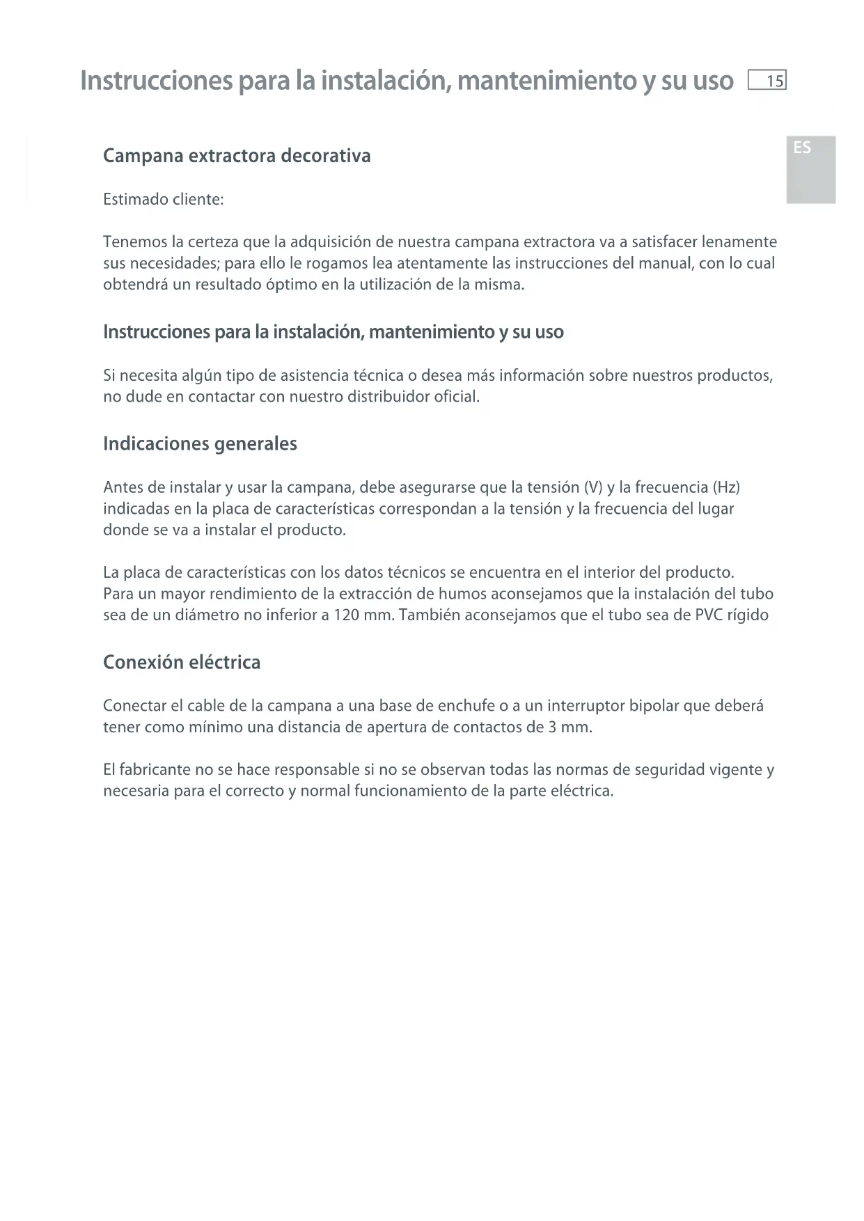 Instrucciones para la instalación, mantenimiento y su uso Campana extractora decorativa Estimado cliente: Tenemos la certeza que la adquisición de nuestra campana extractora va a satisfacer lenamente sus necesidades; para ello le rogamos lea atentamente las instrucciones del manual, con lo cual obtendrá un resultado óptimo en la utilización de la misma. Instrucciones para la instalación, mantenimiento y su uso Si necesita algún tipo de asistencia técnica o desea más información sobre nuestros productos, no dude en contactar con nuestro distribuidor oficial. Indicaciones generales Antes de instalar y usar la campana, debe asegurarse que la tensión (V) y la frecuencia (Hz) indicadas en la placa de características correspondan a la tensión y la frecuencia del lugar donde se va a instalar el producto. La placa de características con los datos técnicos se encuentra en el interior del producto. Para un mayor rendimiento de la extracción de humos aconsejamos que la instalación del tubo sea de un diámetro no inferior a 120 mm. También aconsejamos que el tubo sea de PVC rígido Conexión eléctrica Conectar el cable de la campana a una base de enchufe o a un interruptor bipolar que deberá tener como mínimo una distancia de apertura de contactos de 3 mm. El fabricante no se hace responsable si no se observan todas las normas de seguridad vigente y necesaria para el correcto y normal funcionamiento de la parte eléctrica.16