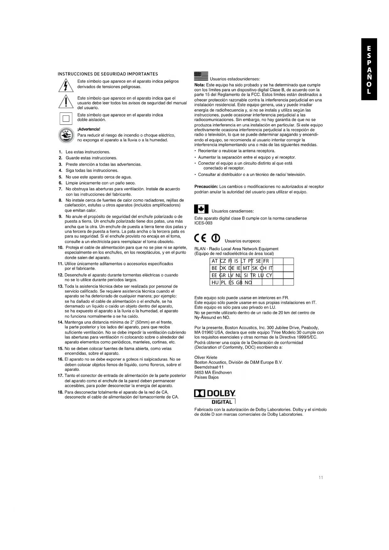- Consultar al distribuidor o a un técnico de radio/ televisión. Precaución: Los cambios o modificaciones no autorizados al receptor podrían anular la autoridad del usuario para utilizar el equipo. Usuarios canadienses: Este aparato digital clase B cumple con la norma canadiense ICES-003 Este equipo solo puede usarse en interiores en FR. Este equipo sólo puede usarse en sus propias instalaciones en IT. Este equipo es sólo para uso privado en LU. No se permite utilizarlo dentro de un radio de 20 km del centro de Ny-Ålesund en NO. Por la presente, Boston Acoustics, Inc. 300 Jubilee Drive, Peabody, MA 01960 USA, declara que este equipo TVee Modelo 30 cumple con los requisitos esenciales y otras normas de la Directiva 1999/5/EC. Podrá obtener una copia de la Declaración de conformidad (Declaration of Conformity, DOC) escribiendo a: Oliver Kriete Boston Acoustics, División de D&M Europe B.V. Beemdstraat 11 5653 MA Eindhoven Países Bajos Fabricado con la autorización de Dolby Laboratories. Dolby y el símbolo de doble D son marcas comerciales de Dolby Laboratories.
