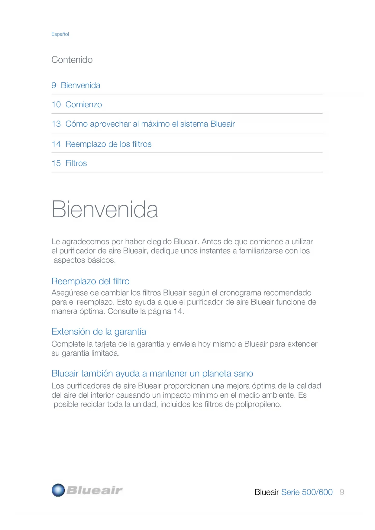 dado. Recuerde que, al igual que los equipos de aire acondicionado y los cale- factores pueden enfriar o calentar volúmenes limitados de aire, cada sistema purificador de aire puede purificar una cantidad limitada de aire. Siga las pautas que se mencionan a continuación. Cierre las ventanas En el verano, no espere que su equipo de aire acondicionado funcione con eficacia si las ventanas están abiertas, porque se puede sentir cómo entra el aire caliente y sale el aire frío. Aunque no pueda ver cómo el aire contaminado entra y sale de la habitación, la misma lógica se aplica a su purificador de aire. Cierre las puertas también De la misma manera que cierra una parte de su casa en una noche fría de invierno para que los calefactores funcionen con más eficacia, para obtener mejores resultados, cierre la habitación en la que esté funcionando el purificador de aire. Esta práctica es muy importante para las personas que utilizan el sistema Blueair para calmar los ataques de asma o alergia durante la noche. Ponga en funcionamiento el sistema durante las 24 horas Para obtener los mejores resultados, haga que la unidad Blueair funcione todos los días, durante las 24 horas. El funcionamiento ininterrumpido asegura que una cantidad constante de aire limpio y filtrado circule de manera regular en toda la habitación. Los sistemas Blueair están diseñados para consumir muy poca energía. De hecho, el purificador de aire Blueair tiene aproximadamente el mismo consumo de energía que un foco encendido, según la unidad y la velocidad de funcionamiento. Español14 Blueair Serie 500/600 Español Reemplazo de los filtros Paso 4 Coloque el primer y el segundo filtro de repuesto dentro de las ranuras laterales. Asegúrese de que el lado que contiene las palabras out/up esté en dirección a la pared más externa de la unidad. Paso 3 Extraiga los filtros de cada lado. Limpie la parrilla desde el interior con una aspiradora. Paso 2 Extraiga el filtro de arriba. Paso 1 Desconecte la unidad y levante la tapa desde la parte superior de la unidad. Paso 6 Coloque la tapa en su lugar. Paso 5 Coloque el tercer filtro en la parte superior de la unidad y compruebe que el lado con las palabras out/up esté hacia arriba. Asegúrese de que el lado del carbono esté siempre mirando hacia afuera.Blueair Serie 500/600 15 Filtros La tecnología patentada HEPASilent™ hace que el purificador de aire Blueair serie 500/600 sea increíblemente silencioso. La unidad viene con un juego completo de tres filtros HEPASilent™ ya instalados. Juego de filtros para partículas. Incluye tres juegos de filtros para partículas que remueven el polvo, el polen, las bacterias, la caspa de las mascotas, las esporas de moho y otras partículas suspendidas en el aire. El filtro para partículas está hecho de polipropileno, que filtra de manera mecánica las partículas sus- pendidas en el aire. Para maximizar la eficacia del filtro, la unidad Blueair emite una carga negativa sobre las partículas antes de que lleguen a los filtros. Juego de filtros Smokestop™. Incluye tres filtros con carbóno activado mejorado para remover los contaminantes gaseosos, como el humo del cigarrillo u otros VOC (compuestos orgánicos, como las pinturas de las casas y otros productos químicos). Cuando utilice el filtro por primera vez, podrá sentir un leve olor proveniente del carbóno activado mejorado, que desaparecerá de inmediato. Para un desempeño óptimo, Blueair recomienda que reemplace los filtros cada seis (6) meses. En algunos países, ofrecemos un conveniente Programa de suscripción de filtros. Póngase en contacto con su distribuidor local o con Blueair para averiguar si el programa está disponible para usted. IMPORTANTE! Utilice únicamente filtros Blueair originales para asegurar el correcto funcionamiento de la unidad y para que la garantía le brinde una cobertura completa. Español Registro del cliente El número de modelo y el número de serie de este producto pueden verse en la parte inferior de la unidad. Anótelos en el espacio proporcionado a continuación y consérvelos para utilizarlos en el futuro. Número de modelo Nombre del distribuidor Número de serie Domicilio del distribuidor Fecha de compra Número de teléfono16 Blueair Série 500/600 Bienvenue Nous vous remercions d’avoir choisi Blueair. Avant de commencer à utiliser votre purificateur d’air Blueair, prenez quelques minutes pour vous familiariser avec son fonctionnement. Remplacement des filtres Assurez-vous de remplacer vos filtres Blueair conformément au calendrier de remplacement des filtres recommandé. Vous pourrez ainsi maximiser le fonctionnement de votre purificateur d’air Blueair. Voir page 21. Garantie prolongée Remplissez et retournez votre carte de garantie à Blueair dès aujourd’hui afin de prolonger votre garantie limitée. Sauvez la planète vous aussi Les purificateurs d’air Blueair permettent d’améliorer au maximum la qualité de l’air intérieur tout en minimisant l’impact sur l’environnement. L’appareil est entièrement recyclable, y compris les filtres en polypropylène. Table des matières 16 Bienvenue 17 Démarrage 20 Comment maximiser le rendement de votre appareil Blueair 21 Remplacement des filtres 22 Filtres FrançaisBlueair Série 500/600 17 Démarrage Instructions de sécurité Le purificateur d’air Blueair de la Série 500/600 est un appareil électrique. Veuillez lire attentivement les instructions de sécurité avant l’utilisation et prenez les précautions nécessaires pour diminuer le risque d’incendie, de blessure ou de choc électrique. La Garantie limitée Blueair s’applique seulement si l’appareil est utilisé conformément à ces instructions.