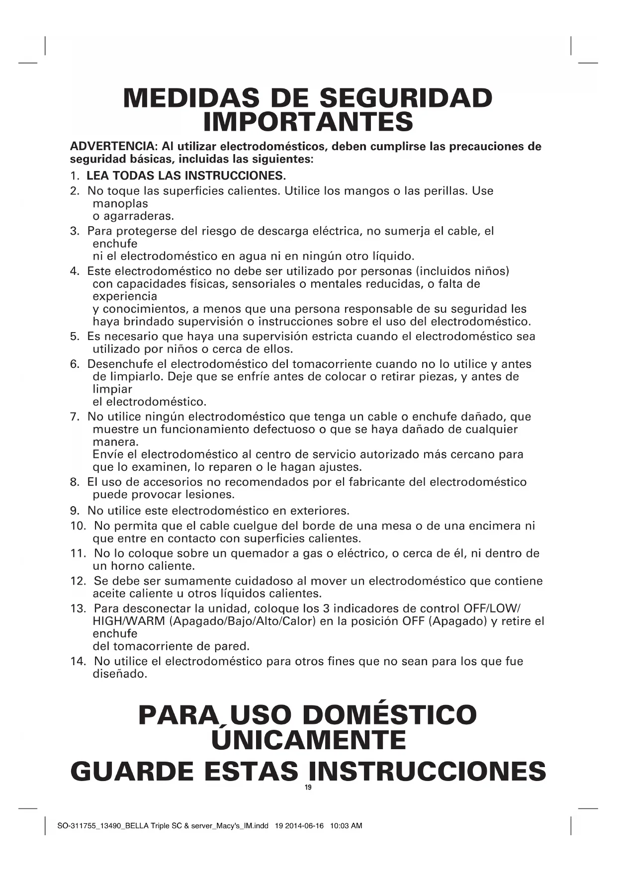 SO-311755_13490_BELLA Triple SC & server_Macy's_IM.indd 19 2014-06-16 10:03 AMOTRAS MEDIDAS DE SEGURIDAD IMPORTANTES PRECAUCIÓN, SUPERFICIES CALIENTES: Este electrodoméstico genera calor y libera vapor mientras está en uso. Se deben tomar las medidas adecuadas para evitar el riesgo de quemaduras, incendios u otro tipo de lesiones personales o daños a la propiedad. PRECAUCIÓN: Este electrodoméstico se calienta durante el funcionamiento y mantiene el calor un tiempo después de apagado. Siempre use manoplas al manipular materiales calientes y deje que las piezas metálicas se enfríen antes de limpiarlas. No coloque nada sobre el electrodoméstico mientras esté en funcionamiento o esté caliente.
