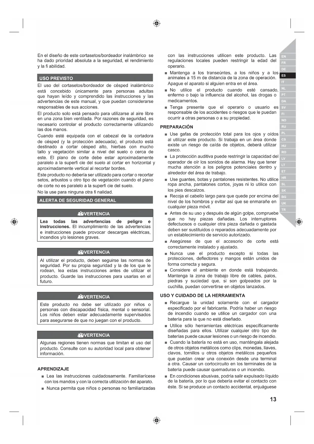 El uso del cortasetos/bordeador de césped inalámbrico está concebido únicamente para personas adultas que hayan leido y comprendido las instrucciones y las advertencias de este manual, y que pueda considerarse responsables de susaxonios.