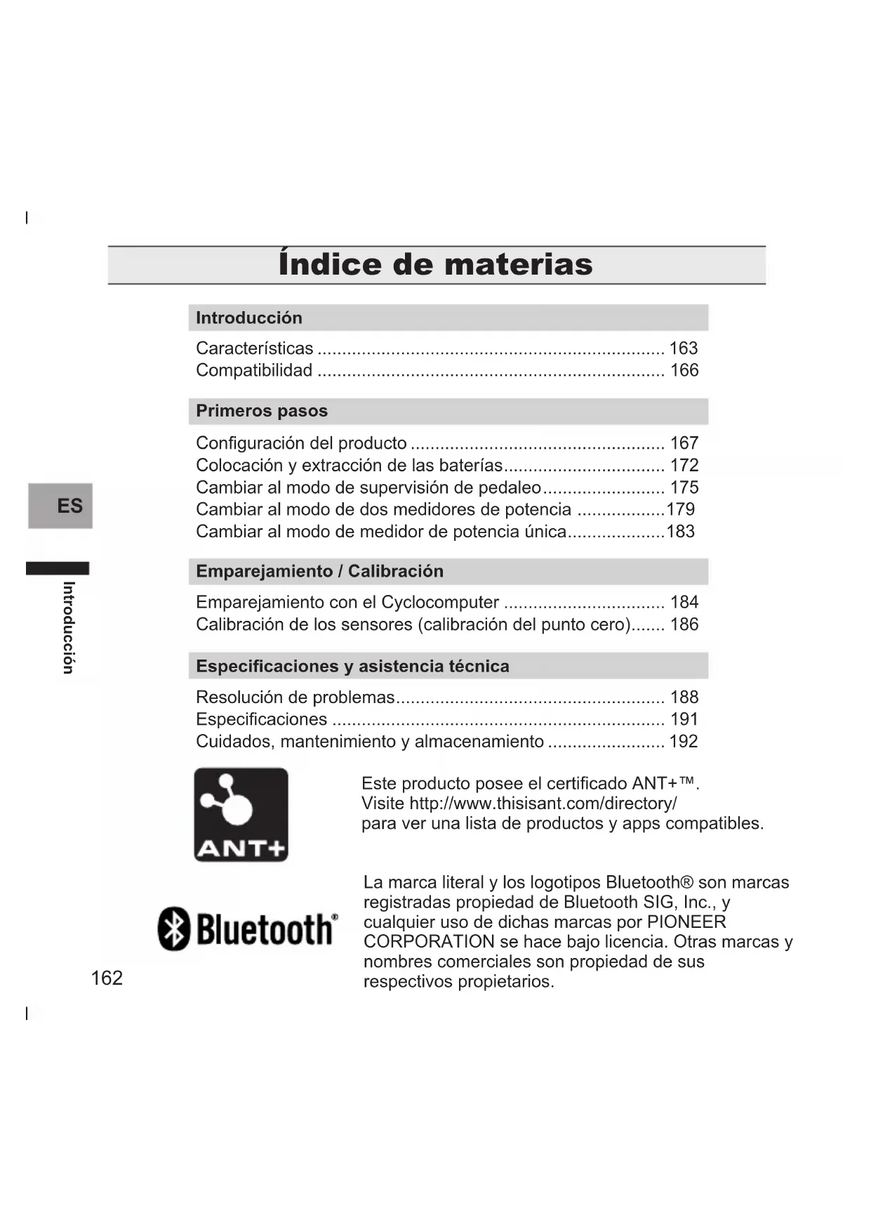 - Cuidados, mantenimiento y almacenamiento Introducción SGY-PM910ZW_ZLW_ZRW_Body.indb 162 2017/8/10 9:57:20 Este producto posee el certificado ANT+™. Visite http://www.thisisant.com/directory/ para ver una lista de productos y apps compatibles. La marca literal y los logotipos Bluetooth® son marcas registradas propiedad de Bluetooth SIG, Inc., y cualquier uso de dichas marcas por PIONEER CORPORATION se hace bajo licencia. Otras marcas y nombres comerciales son propiedad de sus respectivos propietarios.163 p. 192