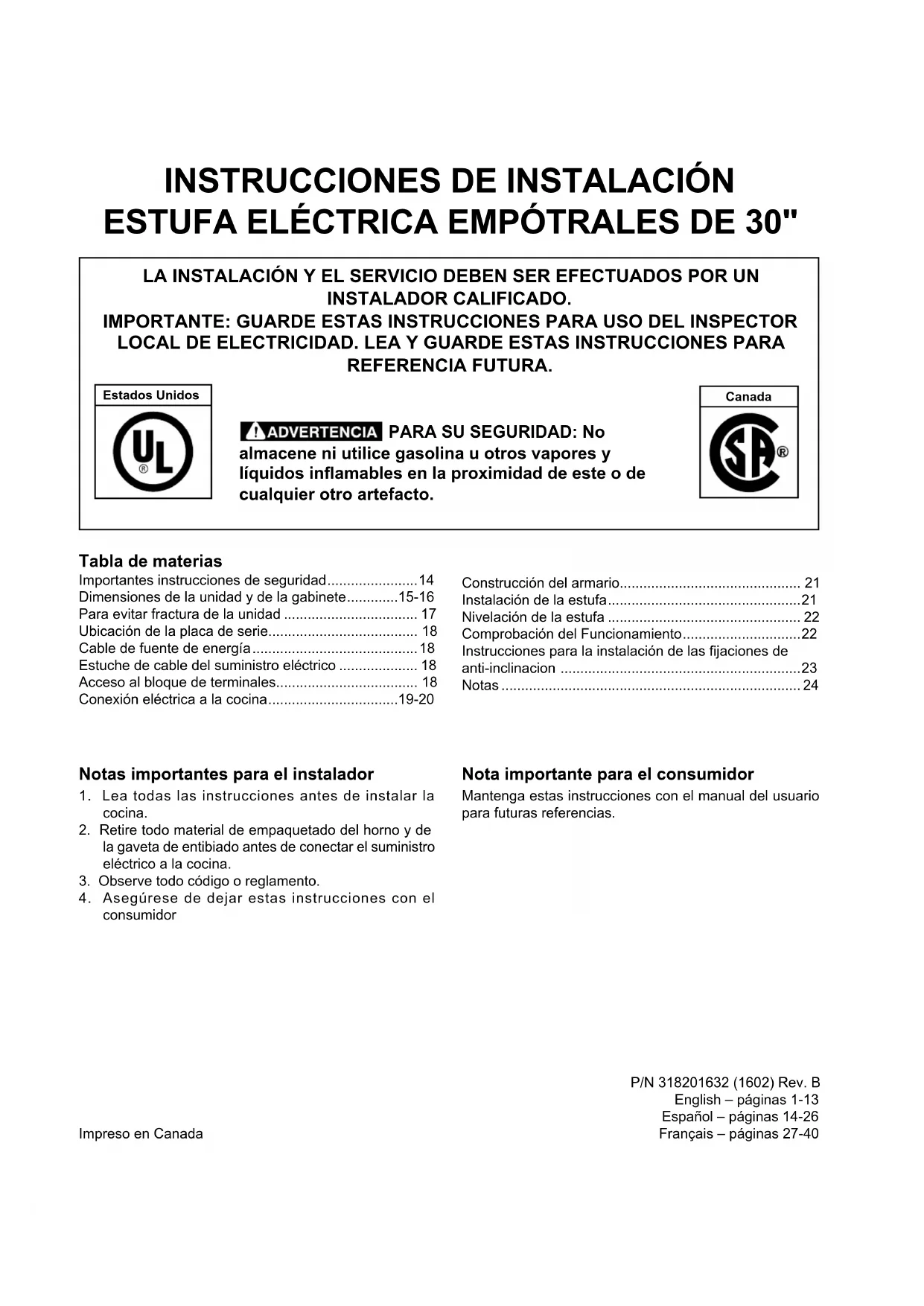 - Notas P/N 318201632 (1602) Rev. B English – páginas 1-13 Español – páginas 14-26 Français – páginas 27-4015 INSTRUCCIONES DE INSTALACIÓN PARA LA ESTUFA ELÉCTRICA DESLIZABLE DE 30" Los controles eléctricos pueden ser dañados con frías temperaturas. Cuando utilice su estufa por la primera vez, o si no ha sido utilizada por mucho tiempo asegúrese que no haya sido expuestas a temperaturas más altas que 0°C/32°F por más de 3 horas antes de conectar su estufa al suministro eléctrico.• Asegúrese que su cocina está instalada y conectada adecuadamente a tierra por un instalador calicado o un técnico de servicio.• Esta cocina debe ser conectada a tierra eléctricamente de acuerdo con los códigos locales, o de no existir, con la National Electrical Code ANSI/NFPA No.70- última edición en el estados unidos o con la CSA Standard C22.1, Canadian Electrical Code, Part 1 en el Canada.• La instalación de electrodomésticos destinados para casas (movibles) deben conformarse con la Manufactured Home Construction and Safety Standard, título 24CFR, parte 3280 [antiguamente la Federal Standard for Mobile Home Construction and Safety, título 24, HUD (parte 280)] o cuando este código no se aplica, la Standard for Manufactured Home Installation 1982 (Manufactured Home sites, communities and setups) ; ANSIZ225.1/NFPA 501A- última edición o con códigos locales en el estados unidos o con CAN/CSA-Z240 MH en el Canada.• Asegúrese que el empapelado de pared alrededor de la cocina pueda resistir el calor generado por la cocina.• Antes de instalar la cocina en una área cubierta de linóleo o cualquier otro revestidos de piso sintético, asegúrese que éste pueda resistir al menos 90°F (32,2°C) sobre la temperatura de la pieza sin encogerse, ladearse o descolorareis. No instale la cocina encima de una alfombra a menos que coloque una placa de aislamiento o una plancha de ¼" (0,64 cm) de madera entre la cocina y el alfombrado. Nunca deje a los niños solos o sin cuidado en el area donde el electrodoméstico está en uso. A medida que los niños crezcan, enséñeles el uso adecuado de los electrodomésticos. Nunca deje la puerta del horno abierta cuando la cocina esté sin supervisión. Pisar, apoyarse o sentarse en las puertas o los cajones de la cocina pueden causar graves heridas y también dañar la cocina.• No coloque cosas que atraigan a los niños sobre los gabinetes encima de la cocina. Los niños podrían sufrir quemaduras tratando de alcanzarlos.• Para evitar riesgos de quemaduras o incendios al tocar superficies calientes, se deben evitar los armarios sobre la superficie de los quemadores. Si existe un armario, se pueden reducir los riesgos instalando una campana que se extienda horizontalmente en un mínimo de 5" por sobre la parte inferior de los armarios. p. 24
