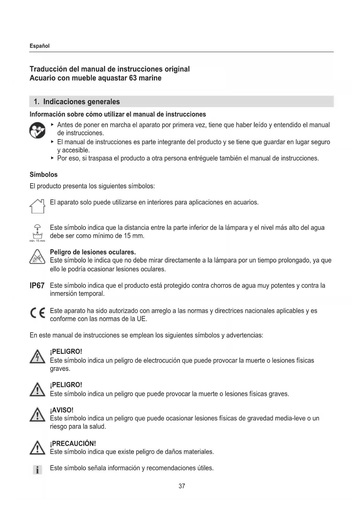 Información sobre cómo utilizar el manual de instrucciones ▶ Antes de poner en marcha el aparato por primera vez, tiene que haber leído y entendido el manual de instrucciones. ▶ El manual de instrucciones es parte integrante del producto y se tiene que guardar en lugar seguro y accesible. ▶ Por eso, si traspasa el producto a otra persona entréguele también el manual de instrucciones. Símbolos El producto presenta los siguientes símbolos: El aparato solo puede utilizarse en interiores para aplicaciones en acuarios. Este símbolo indica que la distancia entre la parte inferior de la lámpara y el nivel más alto del agua debe ser como mínimo de 15 mm. Peligro de lesiones oculares. Este símbolo le indica que no debe mirar directamente a la lámpara por un tiempo prolongado, ya que ello le podría ocasionar lesiones oculares. Este símbolo indica que el producto está protegido contra chorros de agua muy potentes y contra la inmersión temporal. Este aparato ha sido autorizado con arreglo a las normas y directrices nacionales aplicables y es conforme con las normas de la UE. En este manual de instrucciones se emplean los siguientes símbolos y advertencias: ¡PELIGRO! Este símbolo indica un peligro de electrocución que puede provocar la muerte o lesiones físicas graves. ¡PELIGRO! Este símbolo indica un peligro que puede provocar la muerte o lesiones físicas graves. ¡AVISO! Este símbolo indica un peligro que puede ocasionar lesiones físicas de gravedad media-leve o un riesgo para la salud. ¡PRECAUCIÓN! Este símbolo indica que existe peligro de daños materiales. Este símbolo señala información y recomendaciones útiles. min. 15 mm IP6738 Español Presentación de las indicaciones Este símbolo remite a guras, aquí la Figura A. Este símbolo insta a realizar una acción.