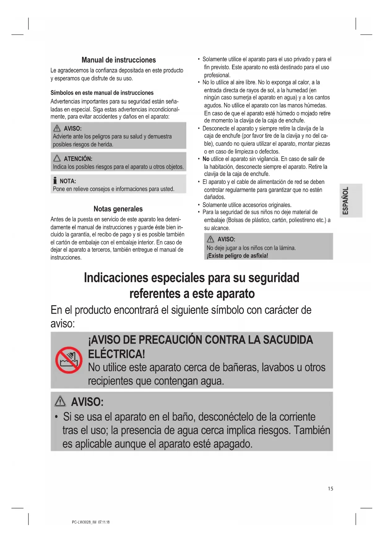 - Si se usa el aparato en el baño, desconéctelo de la corriente tras el uso; la presencia de agua cerca implica riesgos. También es aplicable aunque el aparato esté apagado.16 PC-LW3028_IM 07.11.18 AVISO: