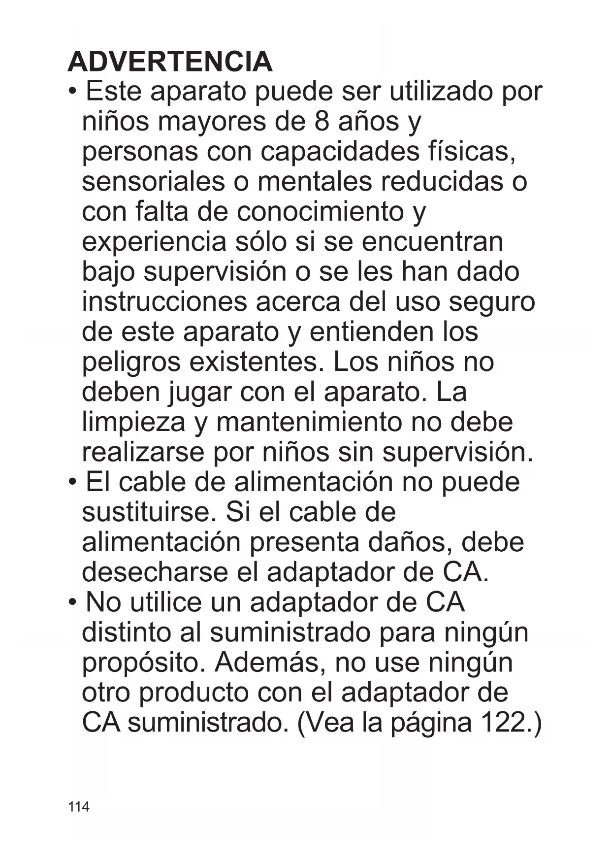 - La batería recargable debe utilizarse exclusivamente con este aparato No utilice la batería con otros productos