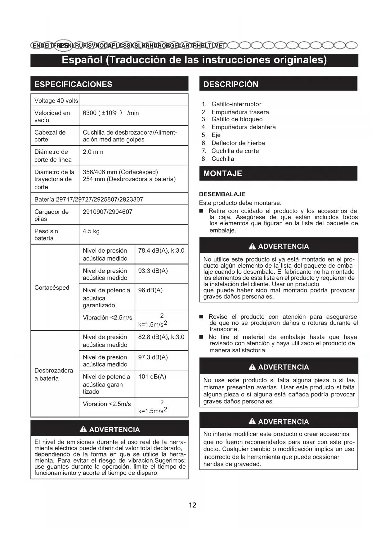 EN DE IT FR PT NL RU FI SV NO DA PL CS SK SL HR HU RO BG EL AR TR HE LT LV ET ESPECIFICACIONES Voltage 40 volts Velocidad en vacío 6300 ( ±10% ) /min Cabezal de corte Cuchilla de desbrozadora/Aliment- ación mediante golpes Diámetro de corte de línea