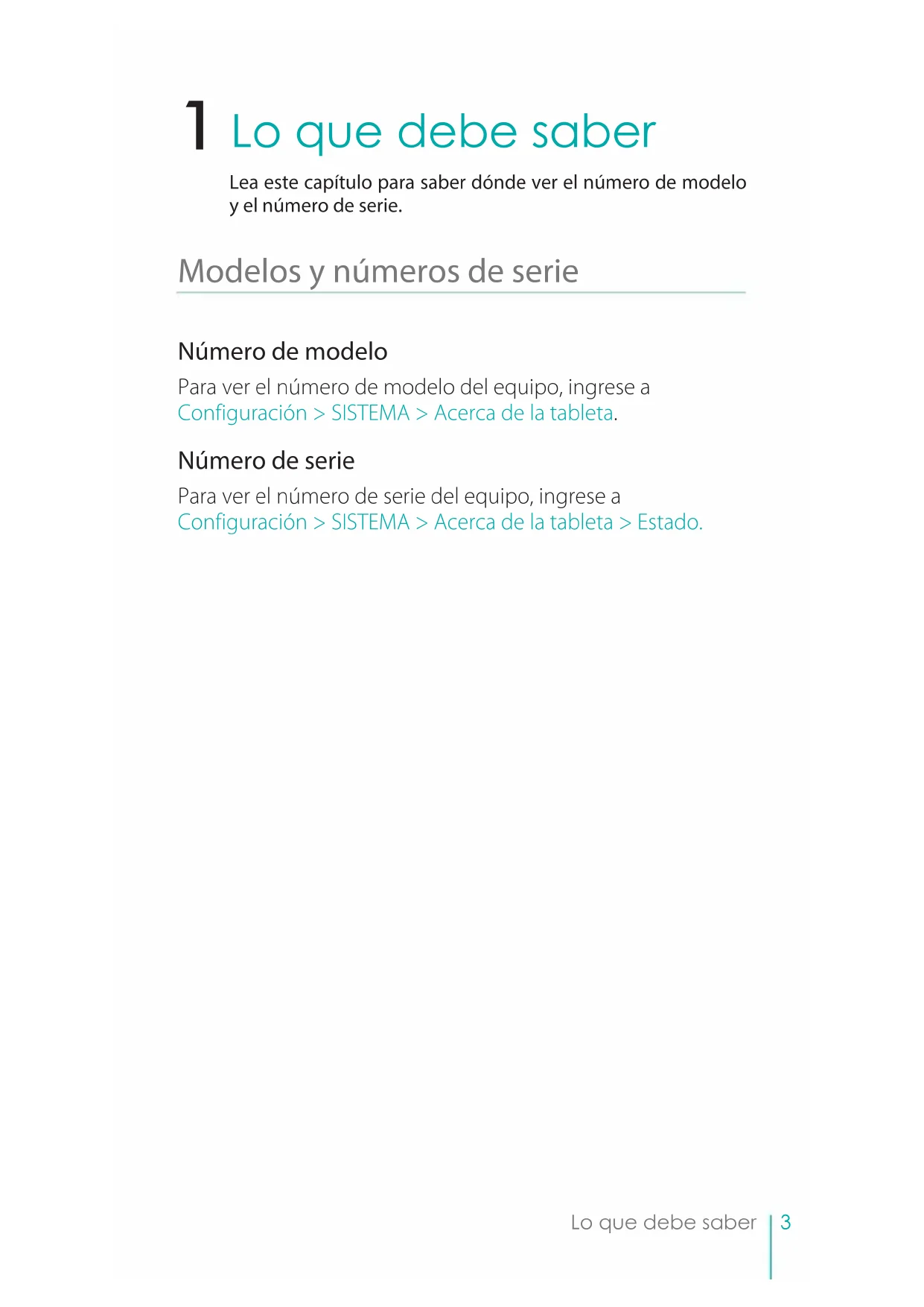 - Copyright y Avisos de marca comercial Lo que debe saber Lo que debe saber Lea este capítulo para saber dónde ver el número de modelo y el número de serie. Modelos y números de serie Número de modelo Para ver el número de modelo del equipo, ingrese a Configuración > SISTEMA > Acerca de la tableta. Número de serie Para ver el número de serie del equipo, ingrese a Configuración > SISTEMA > Acerca de la tableta > Estado. p. 383