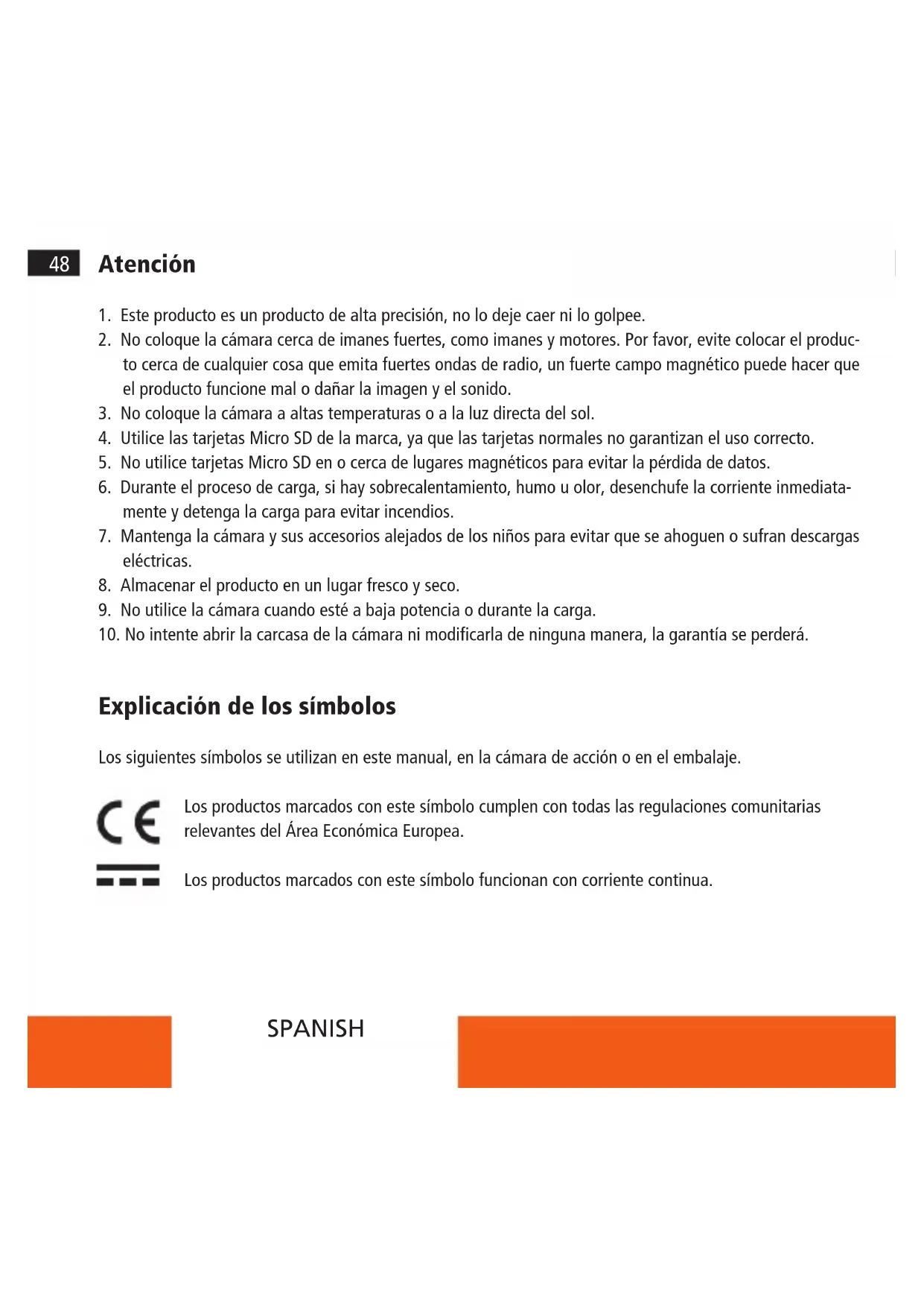 Explicación de los símbolos Los siguientes símbolos se utilizan en este manual, en la cámara de acción o en el embalaje. Los productos marcados con este símbolo cumplen con todas las regulaciones comunitarias relevantes del Área Económica Europea. Los productos marcados con este símbolo funcionan con corriente continua.49 Características del producto Sensor de imagen de 1/3,06“, 13M de resolución Resolución de 20M (5120x3840) (interpolada), 16M (4640x3480) (interpolada), 14M imagen fija (4320x3240) (interpolada), 10M (3648x2736), 8M (3264x2448), 5M (2592x1944), 2M (1600x1200) Resolución de video 4K (3840x2160/60/30fps), 2.7K (2704x1520/30fps), 1080P (1920x1080/60/30fps), 720P (1280x720/120/60fps) Modo de video Normal, lapso de tiempo, cámara lenta, cámara rápida, bucle Modo fotográfico único, ráfaga, cuenta atrás, lapso de tiempo, larga exposición Funciones adicionales Balance de blancos para el submarino, función de cámara web, estabilización electrónica de la imagen Lente Lente gran angular | apertura F = 2,8 | distancia focal f: 2,75 mm Pantalla táctil de 2“ (tamaño de pantalla 5,08 cm) y pantalla de selección de 1,33“ Ranura de memoria para tarjetas microSD de hasta SDXC 64 GB Formato de datos Imagen fija: JPG | Video: MOV Conectores microUSB 2.0, microHDMI, ¼“ hilo de trípode WiFi iEEE 802.11 /b/g/n 2.4 GHz El control remoto incluye un control remoto de 2,4 GHz Caso Impermeable hasta 10m Duración de la batería Hasta 85 minutos con la batería completamente cargada (4K) Alimentación Batería de iones de litio reemplazable (1000 mAh/3,7 Wh) Dimensiones | Peso 65,5 x 43,8 x 26,5 mm | ca. 129 g / 109 g (con / sin batería) Alcance del suministro Rollei Actioncam 8s Plus, funda protectora subacuática para profundidades de hasta 40m, mando a distancia de 2,4 GHz, batería reemplazable, 8 soportes, soporte para casco, cierre de gancho y lazo, pegatinas, bridas para cables, cable metálico, cable USB y tela para el objetivo50 SPANISH