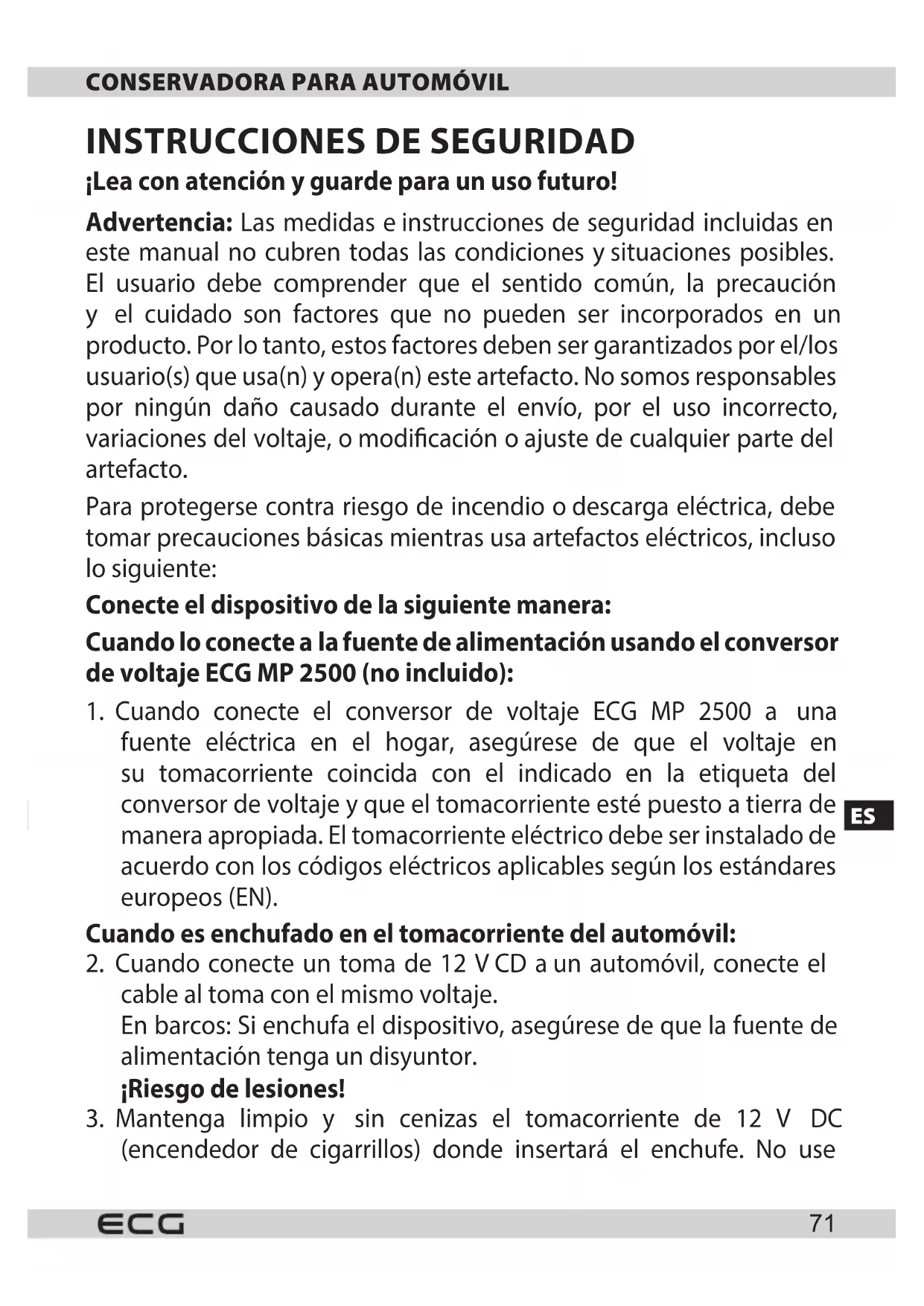 ¡Lea con atención yguarde para un uso futuro! Advertencia: Las medidas einstrucciones de seguridad incluidas en este manual no cubren todas las condiciones ysituaciones posibles. El usuario debe comprender que el sentido común, la precaución y el cuidado son factores que no pueden ser incorporados en un producto. Por lo tanto, estos factores deben ser garantizados por el/los usuario(s) que usa(n) yopera(n) este artefacto. No somos responsables por ningún daño causado durante el envío, por el uso incorrecto, variaciones del voltaje, omodicación oajuste de cualquier parte del artefacto. Para protegerse contra riesgo de incendio odescarga eléctrica, debe tomar precauciones básicas mientras usa artefactos eléctricos, incluso lo siguiente: Conecte el dispositivo de la siguiente manera: Cuando lo conecte ala fuente de alimentación usando el conversor de voltaje ECG MP 2500 (no incluido):