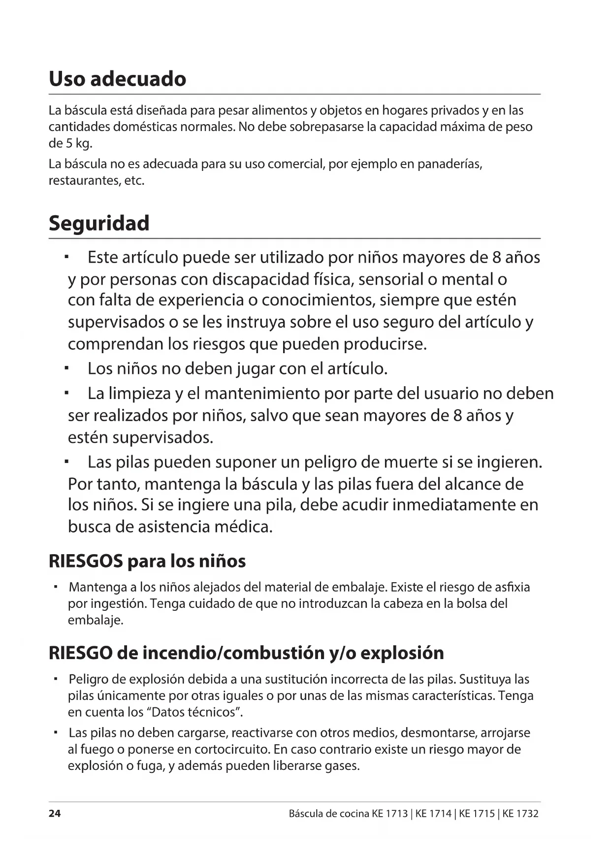 Báscula de cocina KE 1713 | KE 1714 | KE 1715 | KE 1732 Uso adecuado La báscula está diseñada para pesar alimentos y objetos en hogares privados y en las cantidades domésticas normales. No debe sobrepasarse la capacidad máxima de peso de 5 kg. La báscula no es adecuada para su uso comercial, por ejemplo en panaderías, restaurantes, etc. Seguridad Este artículo puede ser utilizado por niños mayores de 8 años y por personas con discapacidad física, sensorial o mental o con falta de experiencia o conocimientos, siempre que estén supervisados o se les instruya sobre el uso seguro del artículo y comprendan los riesgos que pueden producirse. Los niños no deben jugar con el artículo. La limpieza y el mantenimiento por parte del usuario no deben ser realizados por niños, salvo que sean mayores de 8 años y estén supervisados. Las pilas pueden suponer un peligro de muerte si se ingieren. Por tanto, mantenga la báscula y las pilas fuera del alcance de los niños. Si se ingiere una pila, debe acudir inmediatamente en busca de asistencia médica. RIESGOS para los niños Mantenga a los niños alejados del material de embalaje. Existe el riesgo de asxia por ingestión. Tenga cuidado de que no introduzcan la cabeza en la bolsa del embalaje. RIESGO de incendio/combustión y/o explosión Peligro de explosión debida a una sustitución incorrecta de las pilas. Sustituya las pilas únicamente por otras iguales o por unas de las mismas características. Tenga en cuenta los “Datos técnicos”. Las pilas no deben cargarse, reactivarse con otros medios, desmontarse, arrojarse al fuego o ponerse en cortocircuito. En caso contrario existe un riesgo mayor de explosión o fuga, y además pueden liberarse gases. Druckbuch CLEO.indb 24 21.03.2017 08:53:40Seguridad