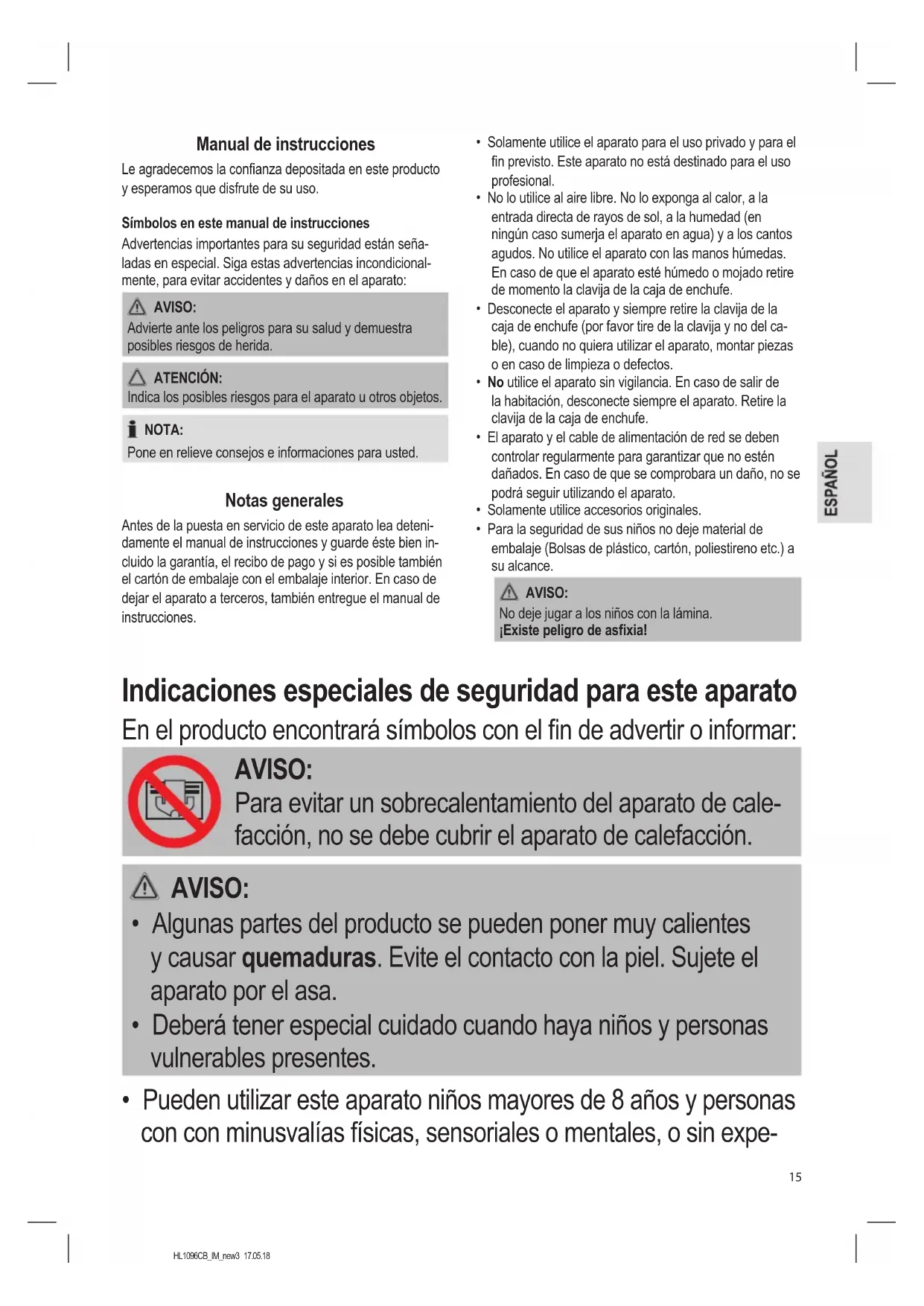 - Para quitar manchas, se puede utilizar un paño humede- cido (no mojado). Datos técnicos Modelo: ...............................................................HL 1096 CB Suministro de tensión: ............................. 220 - 240 V~, 50 Hz Consumo de energía: ...................................... 1800 - 2000 W Clase de protección: ............................................................ Peso neto: ........................................................ aprox. 0,92 kg El derecho de realizar modicaciones técnicas y de diseño en el curso del desarrollo continuo del producto está reservado. Este aparato se ha examinado según las normativas actuales y vigentes de la Comunidad Europea, como p. ej. compatibilidad electromagnética y directiva de baja tensión y se ha construido según las más nuevas especicaciones en razón de la seguridad. Eliminación Signicado del símbolo “Cubo de basura” Proteja nuestro medio ambiente, aparatos eléc- tricos no forman parte de la basura doméstica. Haga uso de los centros de recogida previstos para la eliminación de aparatos eléctricos y entregue allí sus aparatos eléctricos que no vaya a utilizar más. Ayudará en evitar las potenciales consecuencias, a causa de una errónea eliminación de desechos, para el medio ambiente y la salud humana. Con ello, contribuirá a la recuperación, al reciclado y a otras formas de reutilización de los aparatos viejos eléctricos y electrónicos. La información cómo se debe eliminar los aparatos, se obtiene en su ayuntamiento o su administración municipal.HL1096CB_IM_new3 17.05.18