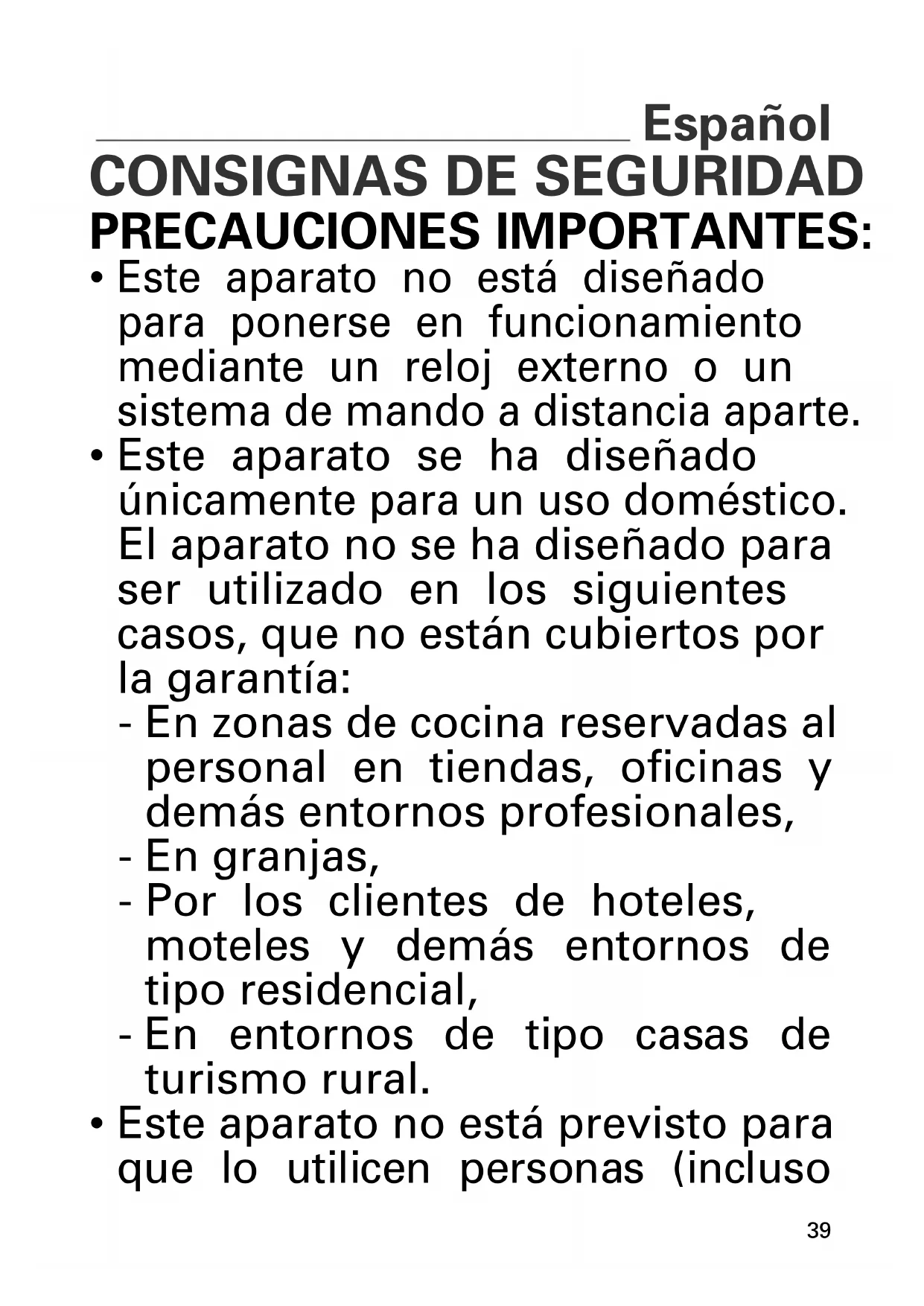 - Este aparato se ha diseñado únicamente para un uso doméstico. El aparato no se ha diseñado para ser utilizado en los siguientes casos, que no están cubiertos por la garantía: - En zonas de cocina reservadas al personal en tiendas, oficinas y demás entornos profesionales, - En granjas, - Por los clientes de hoteles, moteles y demás entornos de tipo residencial, - En entornos de tipo casas de turismo rural.