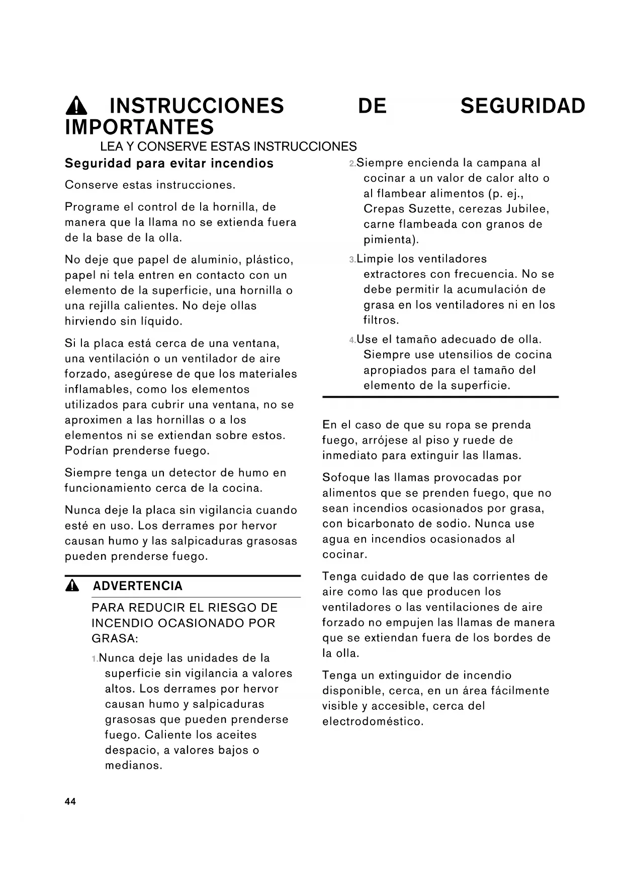 Siempre use utensilios de cocina apropiados para el tamaño del elemento de la superficie. En el caso de que su ropa se prenda fuego, arrójese al piso y ruede de inmediato para extinguir las llamas. Sofoque las llamas provocadas por alimentos que se prenden fuego, que no sean incendios ocasionados por grasa, con bicarbonato de sodio. Nunca use agua en incendios ocasionados al cocinar. Tenga cuidado de que las corrientes de aire como las que producen los ventiladores o las ventilaciones de aire forzado no empujen las llamas de manera que se extiendan fuera de los bordes de la olla. Tenga un extinguidor de incendio disponible, cerca, en un área fácilmente visible y accesible, cerca del electrodoméstico.45
