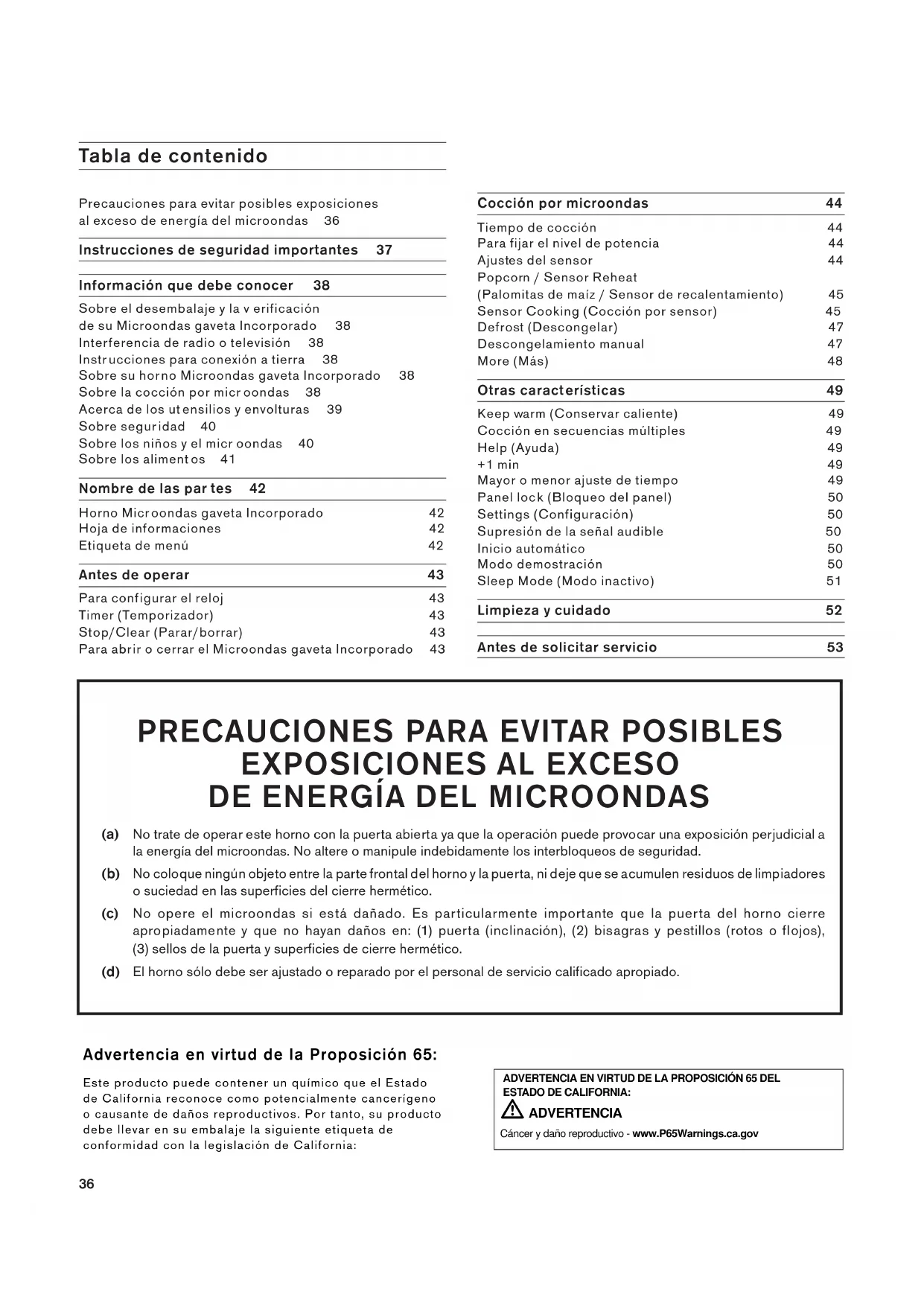 (a) No trate de operar este horno con la puerta abierta ya que la operación puede provocar una exposición perjudicial a la energía del microondas. No altere o manipule indebidamente los interbloqueos de seguridad. (b) No coloque ningún objeto entre la parte frontal del horno y la puerta, ni deje que se acumulen residuos de limpiadores o suciedad en las superficies del cierre hermético. (c) No opere el microondas si está dañado. Es particularmente importante que la puerta del horno cierre apropiadamente y que no hayan daños en: (1) puerta (inclinación), (2) bisagras y pestillos (rotos o flojos), (3) sellos de la puerta y superficies de cierre hermético. (d) El horno sólo debe ser ajustado o reparado por el personal de servicio calificado apropiado. Advertencia en virtud de la Proposición 65: Este producto puede contener un químico que el Estado de California reconoce como potencialmente cancerígeno o causante de daños reproductivos. Por tanto, su productodebe llevar en su embalaje la siguiente etiqueta deconformidad con la legislación de California:$'9(57(1&,$(19,578''(/$352326,&,Ð1'(/(67$'2'(&$/,)251,$ $'9(57(1&,$&iQFHU\GDxRUHSURGXFWLYRZZZ3:DUQLQJVFDJRY37 InStruccIoneS De SeGurIDaD IMportanteS