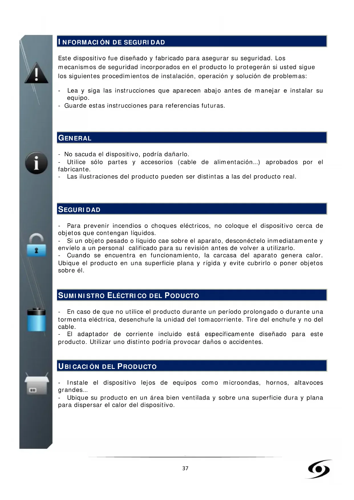 Este dispositivo fue diseñado y fabricado para asegurar su seguridad. Los mecanismos de seguridad incorporados en el producto lo protegerán si usted sigue los siguientes procedimientos de instalación, operación y solución de problemas: - Lea y siga las instrucciones que aparecen abajo antes de manejar e instalar su equipo. - Guarde estas instrucciones para referencias futuras.