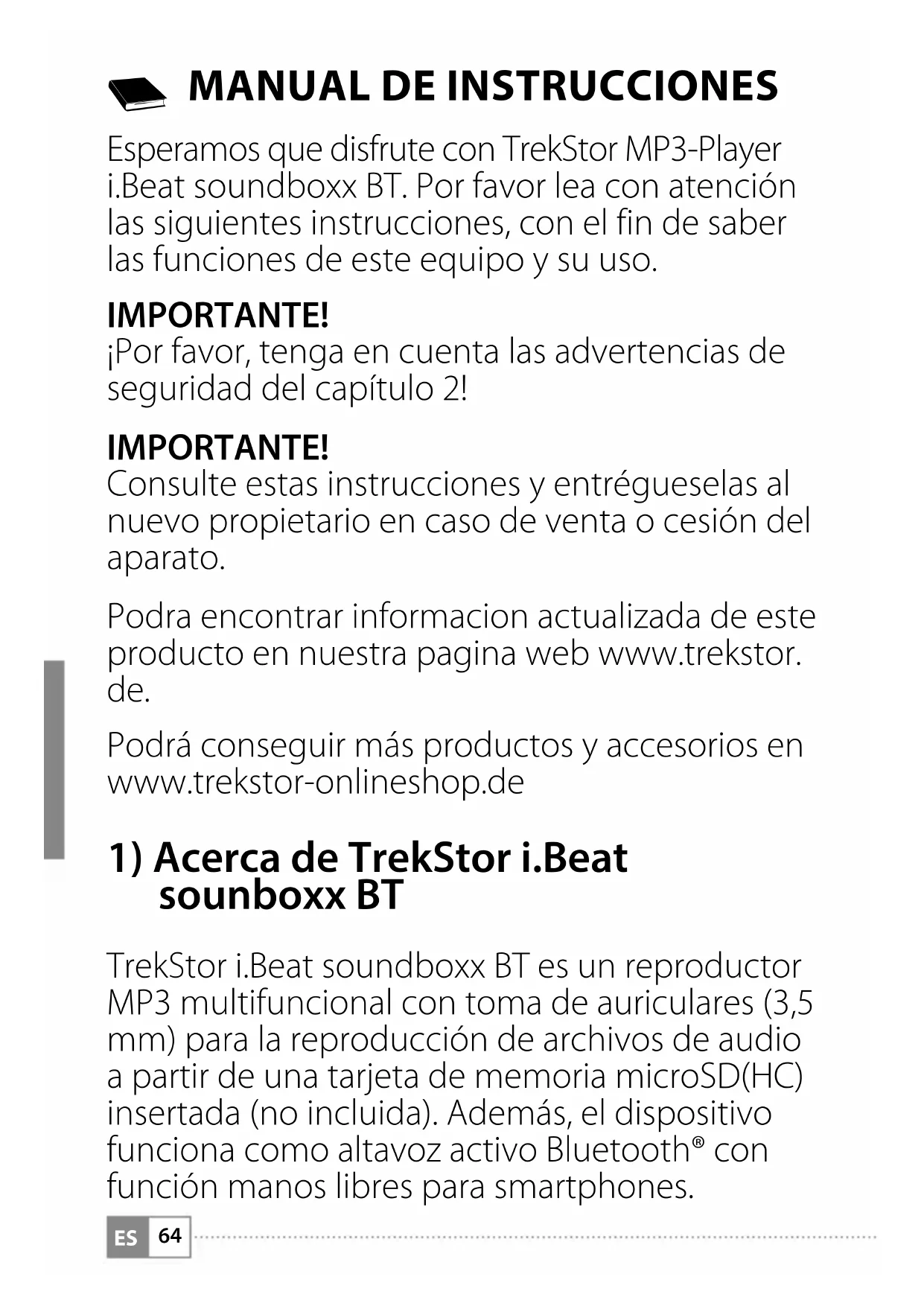 Esperamos que disfrute con TrekStor MP3-Player i.Beat soundboxx BT. Por favor lea con atención las siguientes instrucciones, con el fin de saber las funciones de este equipo y su uso. IMPORTANTE! ¡Por favor, tenga en cuenta las advertencias de seguridad del capítulo 2! IMPORTANTE! Consulte estas instrucciones y entrégueselas al nuevo propietario en caso de venta o cesión del aparato. Podra encontrar informacion actualizada de este producto en nuestra pagina web www.trekstor. de. Podrá conseguir más productos y accesorios en www.trekstor-onlineshop.de