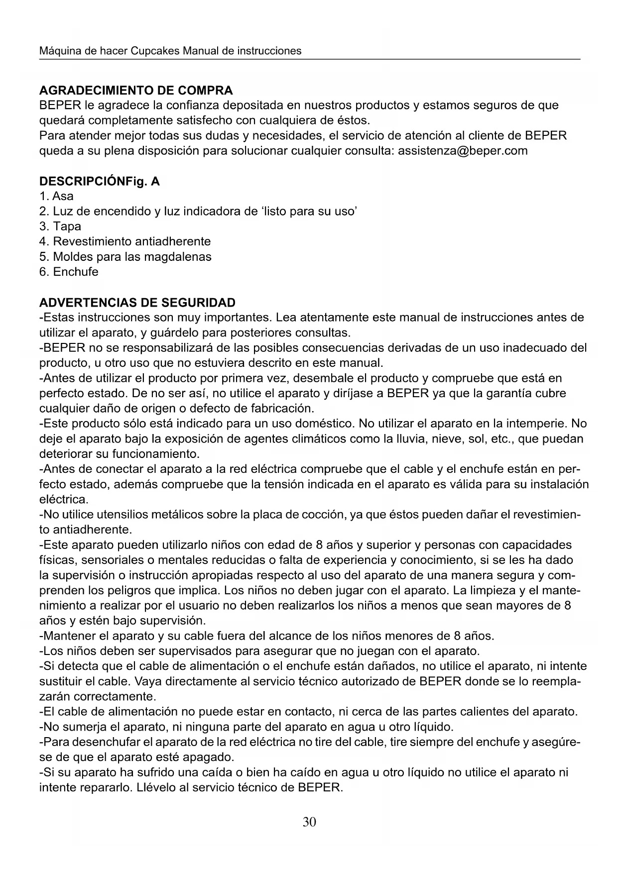 -Estas instrucciones son muy importantes. Lea atentamente este manual de instrucciones antes de utilizar el aparato, y guárdelo para posteriores consultas. -BEPER no se responsabilizará de las posibles consecuencias derivadas de un uso inadecuado del producto, u otro uso que no estuviera descrito en este manual. -Antes de utilizar el producto por primera vez, desembale el producto y compruebe que está en perfecto estado. De no ser así, no utilice el aparato y diríjase a BEPER ya que la garantía cubre cualquier daño de origen o defecto de fabricación. -Este producto sólo está indicado para un uso doméstico. No utilizar el aparato en la intemperie. No deje el aparato bajo la exposición de agentes climáticos como la lluvia, nieve, sol, etc., que puedan deteriorar su funcionamiento. -Antes de conectar el aparato a la red eléctrica compruebe que el cable y el enchufe están en per- fecto estado, además compruebe que la tensión indicada en el aparato es válida para su instalación eléctrica. -No utilice utensilios metálicos sobre la placa de cocción, ya que éstos pueden dañar el revestimien- to antiadherente. -Este aparato pueden utilizarlo niños con edad de 8 años y superior y personas con capacidades físicas, sensoriales o mentales reducidas o falta de experiencia y conocimiento, si se les ha dado la supervisión o instrucción apropiadas respecto al uso del aparato de una manera segura y com- prenden los peligros que implica. Los niños no deben jugar con el aparato. La limpieza y el mante- nimiento a realizar por el usuario no deben realizarlos los niños a menos que sean mayores de 8 años y estén bajo supervisión. -Mantener el aparato y su cable fuera del alcance de los niños menores de 8 años. -Los niños deben ser supervisados para asegurar que no juegan con el aparato. -Si detecta que el cable de alimentación o el enchufe están dañados, no utilice el aparato, ni intente sustituir el cable. Vaya directamente al servicio técnico autorizado de BEPER donde se lo reempla- zarán correctamente. -El cable de alimentación no puede estar en contacto, ni cerca de las partes calientes del aparato. -No sumerja el aparato, ni ninguna parte del aparato en agua u otro líquido. -Para desenchufar el aparato de la red eléctrica no tire del cable, tire siempre del enchufe y asegúre- se de que el aparato esté apagado. -Si su aparato ha sufrido una caída o bien ha caído en agua u otro líquido no utilice el aparato ni intente repararlo. Llévelo al servicio técnico de BEPER.31 ESPAÑOL Máquina de hacer Cupcakes Manual de instrucciones -No mover el aparato cuando éste está en funcionamiento, ni toque las parte calientes del aparato, puede provocar daños y quemaduras. -Nunca deje el cable del aparato colgando ni en contacto con partes calientes. -Para su seguridad y mejor funcionamiento del aparato utilice siempre accesorios y repuestos de BEPER. -Si la supercie se rompe, apague el aparato para evitar la posibilidad de choque eléctrico. -Utilizar el aparato en una supercie plana, lisa y horizontal y que pueda soportar altas temperatu- ras. aTenciÓn: En supercies en las que el calor puede resultar un problema, se recomienda utilizar una almohadilla termo-aislante. -No deje el aparato encima o cerca de un quemador de gas o eléctrico caliente, dentro o junto a un horno caliente o un horno microondas. -Deje suciente espacio encima y a los lados del aparato para una correcta circulación de aire. -No permita que el aparato esté en contacto con cortinas, papeles pintados, paños de cocina, u otros materiales inamables durante su uso. -No utilice otro conector diferente al suministrado con el producto. -Desaconsejamos el uso de adaptadores, enchufes y/o cables de extensión. Si dichos elementos fueran indispensables, use sólo adaptadores simples o múltiples y cables de extensión que respe- ten las normas de seguridad vigentes, cuidando en no sobrepasar el límite de potencia indicado en el adaptador y/o e el cable de extensión. -No utilice el aparato junto con un temporizador o un sistema de telecontrol por separado y no lo deje desatendido. aTenciÓn: Este aparato está caliente durante el funcionamiento y retiene el calor durante algún tiempo después de terminar la cocción. Siempre use guantes resistentes al calor al manipular ma- teriales calientes y permita que las partes metálicas se enfríen antes de limpiar. No coloque nada en la parte superior del aparato mientras esté funcionando o cuando esté caliente. MODO De eMpLeO -Antes de utilizar el aparato por primera vez limpie la supercie con un paño húmedo y déjelo secar. -Antes de la cocción de las magdalenas, pase un poco de aceite a las dos placas superior e inferior del aparato. Esto ayudará a retirar las magdalenas después de la cocción. -Enchufe el aparato. Se encenderá la luz roja mientras el aparato se calienta. nOTa: Cuando el aparato se calienta por primera vez, puede emitir un leve humo u olor. Esto es normal y debe desaparecer después de 1 ó 2 usos. Esto no afecta a la seguridad del aparato. Sin embargo, ya que puede afectar el sabor de las primeras magdalenas, se recomienda que éstas se descarten, o se haga funcionar el aparato en vacío durante unos minutos. -Después de aproximadamente 2 ó 3 minutos, la unidad se precalienta y está lista para su uso. Se encenderá la luz verde. -Coloque la masa de las magdalenas en cada uno de los moldes. nOTa: No llene en exceso los moldes del aparato, ya que la masa aumentará de volumen cuando se cocine. Rellene hasta máximo 2/3 de la capacidad del molde. -Cierre el aparato: baje la tapa del aparato con la ayuda del asa. -Deje cocer la masa durante unos 5 minutos aproximadamente. -Al nal del tiempo de cocción, utilice el asa para levantar la tapa superior. Si es necesario, cerrar de nuevo y continuar la cocción durante unos segundos hasta que las magdalenas estén cocidas a su gusto.32 Máquina de hacer Cupcakes Manual de instrucciones 