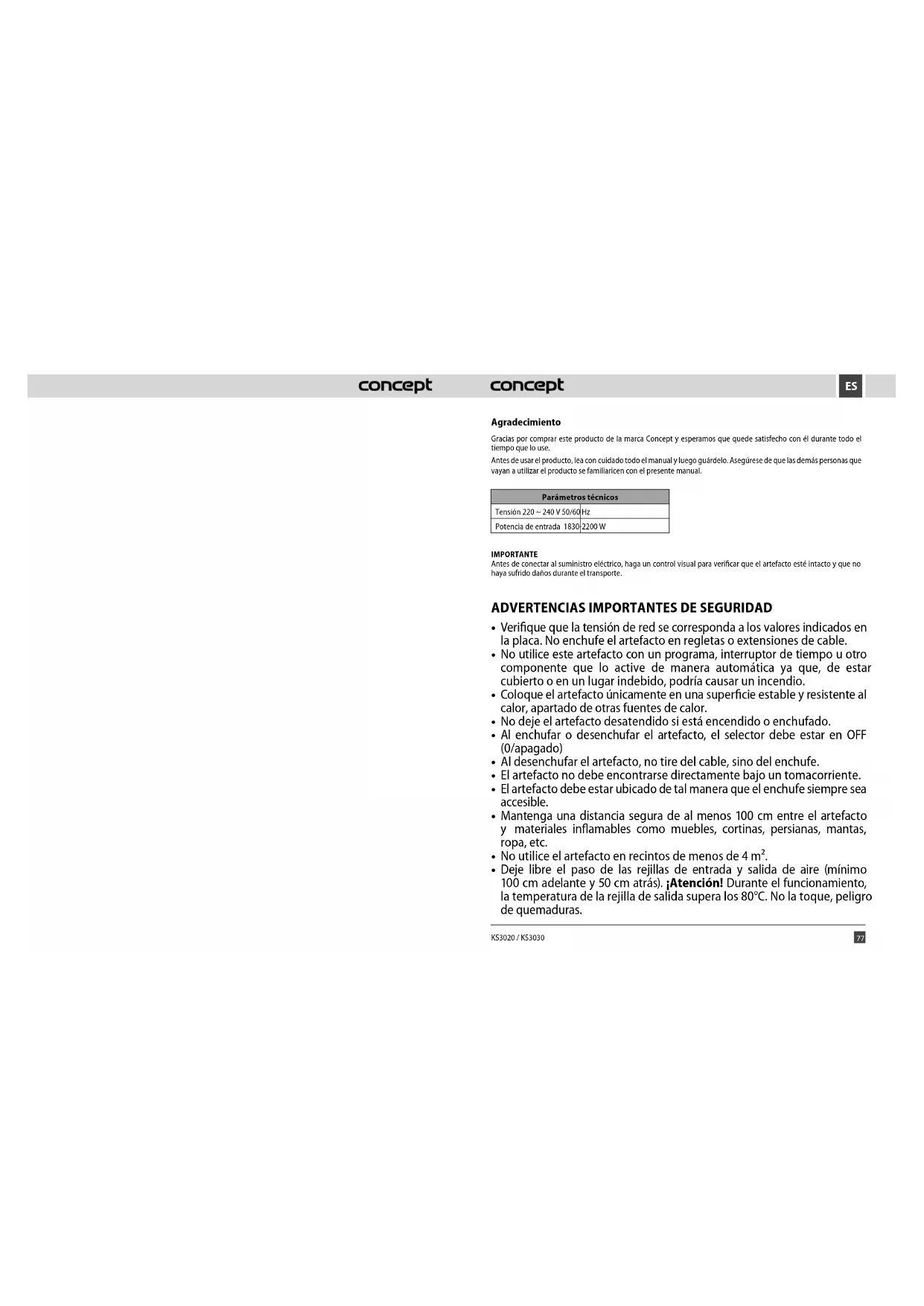 Agradecimiento Gracias por comprar este producto de la marca Concept y esperamos que quede satisfecho con él durante todo el tiempo que lo use. Antes de usar el producto, lea con cuidado todo el manual y luego guárdelo. Asegúrese de que las demás personas que vayan a utilizar el producto se familiaricen con el presente manual. Parámetros técnicos Tensión 220 ~ 240 V 50/60 Hz Potencia de entrada 1830-2200 W IMPORTANTE Antes de conectar al suministro eléctrico, haga un control visual para verificar que el artefacto esté intacto y que no haya sufrido daños durante el transporte.