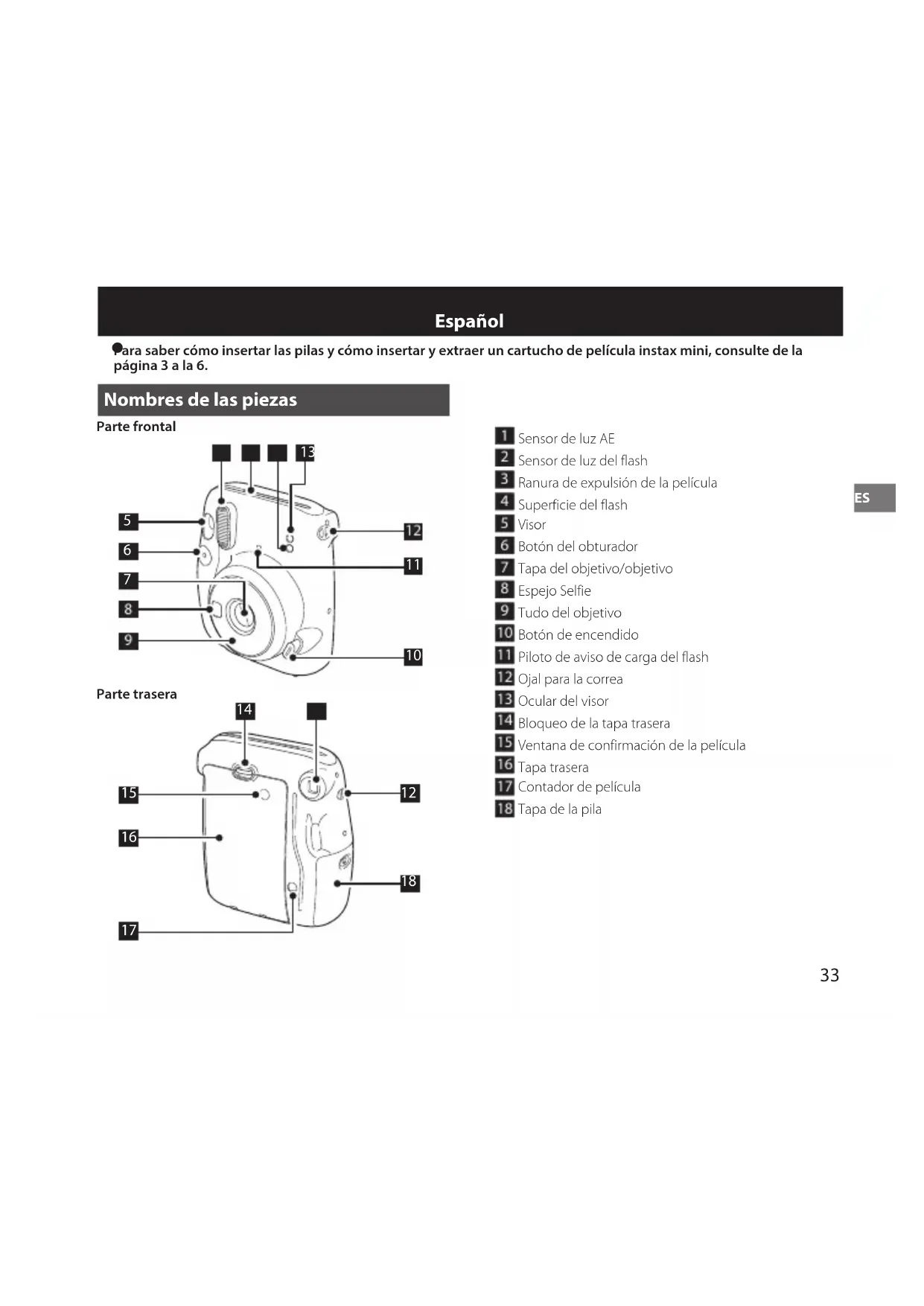 Para saber cómo insertar las pilas y cómo insertar y extraer un cartucho de película instax mini, consulte de la página 3 a la 6.34