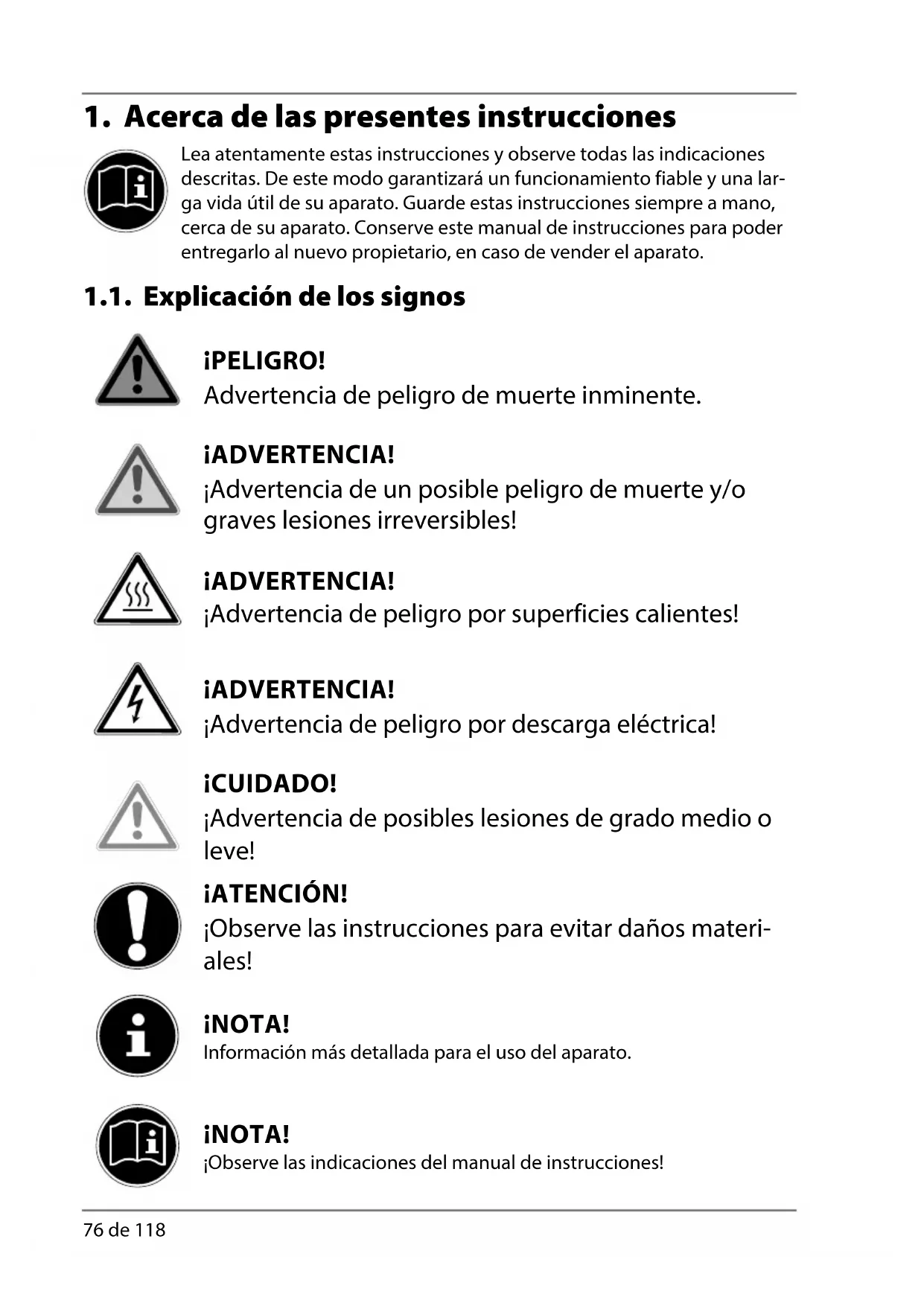 Lea atentamente estas instrucciones y observe todas las indicaciones descritas. De este modo garantizará un funcionamiento fiable y una lar- ga vida útil de su aparato. Guarde estas instrucciones siempre a mano, cerca de su aparato. Conserve este manual de instrucciones para poder entregarlo al nuevo propietario, en caso de vender el aparato. 1.1. Explicación de los signos ¡PELIGRO! Advertencia de peligro de muerte inminente. ¡ADVERTENCIA! ¡Advertencia de un posible peligro de muerte y/o graves lesiones irreversibles! ¡ADVERTENCIA! ¡Advertencia de peligro por superficies calientes! ¡ADVERTENCIA! ¡Advertencia de peligro por descarga eléctrica! ¡CUIDADO! ¡Advertencia de posibles lesiones de grado medio o leve! ¡ATENCIÓN! ¡Observe las instrucciones para evitar daños materi- ales! ¡NOTA! Información más detallada para el uso del aparato. ¡NOTA! ¡Observe las indicaciones del manual de instrucciones!77 de 118