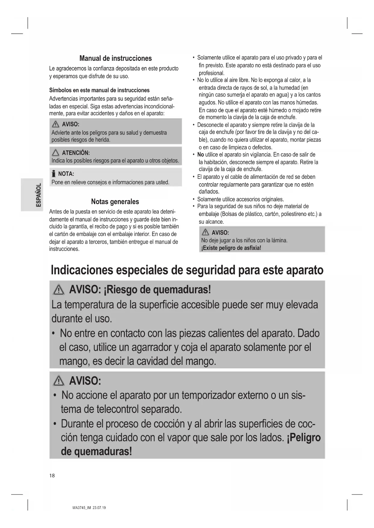 - Durante el proceso de cocción y al abrir las supercies de coc- ción tenga cuidado con el vapor que sale por los lados. ¡Peligro de quemaduras!WA3745_IM 23.07.19