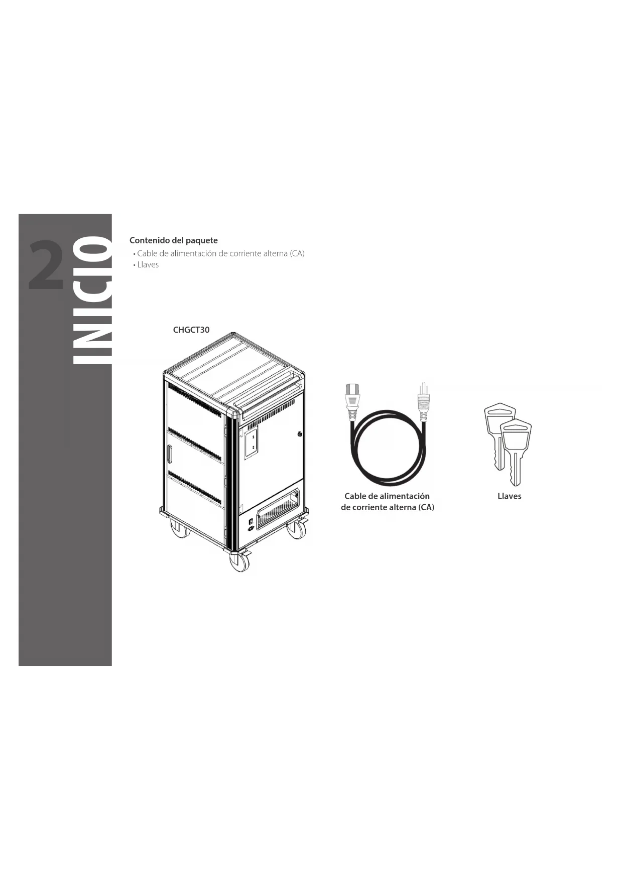 - Llaves Cable de alimentación de corriente alterna (CA) Llaves CHGCT30Diagrama del armario Parte delantera Tirador Puerta de servicio Soporte del cable de alimentación Indicador de carga LED Rueda de 5" Rueda de 5" con freno Enganche para el candado Interruptor Entrada de corriente Protectores de goma (en las 4 esquinas) Soportes de la fuente de alimentación Unidades de distribución de alimentación (PDU) integradas Punto de bloqueo *Candado de seguridad no incluido Ranuras para los dispositivos Agujero para pasar el cable de alimentaciónRetirar del palé