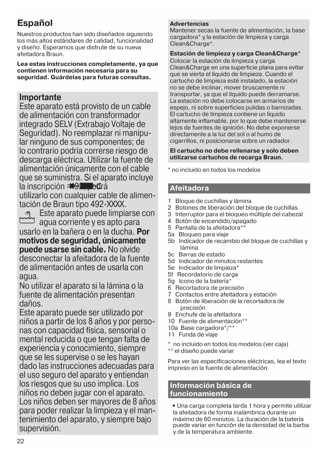démarrage. Augmentation de la consommation de liquide de nettoyage. L’orifice de la station Clean& Charge est bouché. – Nettoyez l’orifice avec un cure-dent en bois. – Nettoyez régulièrement le bac de nettoyage. Garantie Nous accordons une garantie de 2 ans sur ce produit, à partir de la date d’achat. Pendant la durée de la garantie, Braun prendra gratuitement à sa charge la réparation des vices de fabrication ou de matière en se réservant le droit de décider si certaines pièces doivent être réparées ou si l’appareil lui-même doit être échangé. Cette garantie s’étend à tous les pays où cet appareil est commercialisé par Braun ou son distributeur exclusif. Cette garantie ne couvre pas : les dommages occasionnés par une utilisation inadéquate, l’usure normale (par exemple, grille et bloc-couteaux) ainsi que les défauts d’usures qui ont un effet négligeable sur la valeur ou l’utilisation de l’appareil. Cette garantie devient caduque si des réparations ont été effectuées par des personnes non agréées par Braun et si des pièces de rechange ne provenant pas de Braun ont été utilisées. Pour toute réclamation intervenant pendant la période de garantie, retournez ou rapportez l’appareil ainsi que l’attestation de garantie à votre revendeur ou à un Centre Service Agréé Braun. Veuillez vous référer à www.service.braun.com ou appeler le 0 800 944 802 (service consommateurs – service & appel gratuits) pour connaître le Centre Service Agréé Braun le plus proche de chez vous. Clause spéciale pour la France Outre la garantie contractuelle exposée ci-dessus, nos clients bénéficient de la garantie légale des vices caches prévue aux articles 1641 et suivants du Code civil. 91611492_93XXcc_W&D_MN_Type_5793_S6-76.indd 2191611492_93XXcc_W&D_MN_Type_5793_S6-76.indd 21 20.10.17 08:1620.10.17 08:16 CSS APPROVED Effective Date 23Oct2017 GMT - Printed 22Nov2017 Page 21 of 7622 Español Nuestros productos han sido diseñados siguiendo los más altos estándares de calidad, funcionalidad y diseño. Esperamos que disfrute de su nueva afeitadora Braun. Lea estas instrucciones completamente, ya que contienen información necesaria para su seguridad. Guárdelas para futuras consultas. Importante Este aparato está provisto de un cable de alimentación con transformador integrado SELV (Extrabajo Voltaje de Seguridad). No reemplazar ni manipu- lar ninguno de sus componentes; de lo contrario podría correrse riesgo de descarga eléctrica. Utilizar la fuente de alimentación únicamente con el cable que se suministra. Si el aparato incluye la inscripción 492, podrá utilizarlo con cualquier cable de alimen- tación de Braun tipo 492-XXXX. Este aparato puede limpiarse con agua corriente y es apto para usarlo en la bañera o en la ducha. Por motivos de seguridad, únicamente puede usarse sin cable. No olvide desconectar la afeitadora de la fuente de alimentación antes de usarla con agua. No utilizar el aparato si la lámina o la fuente de alimentación presentan daños. Este aparato puede ser utilizado por niños a partir de los 8 años y por perso- nas con capacidad física, sensorial o mental reducida o que tengan falta de experiencia y conocimiento, siempre que se les supervise o se les hayan dado las instrucciones adecuadas para el uso seguro del aparato y entiendan los riesgos que su uso implica. Los niños no deben jugar con el aparato. Los niños deben ser mayores de 8 años para poder realizar la limpieza y el man- tenimiento del aparato, y siempre bajo supervisión. Advertencias Mantener secas la fuente de alimentación, la base cargadora* y la estación de limpieza y carga Clean&Charge*. Estación de limpieza y carga Clean&Charge* Colocar la estación de limpieza y carga Clean&Charge en una superficie plana para evitar que se vierta el líquido de limpieza. Cuando el cartucho de limpieza esté instalado, la estación no se debe inclinar, mover bruscamente ni transportar, ya que el líquido puede derramarse. La estación no debe colocarse en armarios de espejo, ni sobre superficies pulidas o barnizadas. El cartucho de limpieza contiene un líquido altamente inflamable, por lo que debe mantenerse lejos de fuentes de ignición. No debe exponerse directamente a la luz del sol o al humo de cigarrillos, ni posicionarse sobre un radiador. El cartucho no debe rellenarse y solo deben utilizarse cartuchos de recarga Braun.