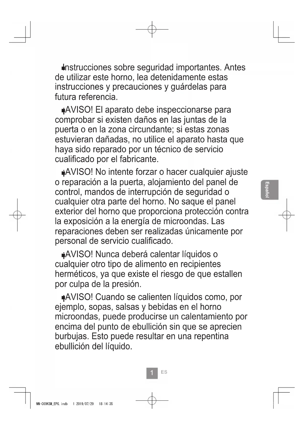 ¡AVISO! Cuando se calienten líquidos como, por ejemplo, sopas, salsas y bebidas en el horno microondas, puede producirse un calentamiento por encima del punto de ebullición sin que se aprecien burbujas. Esto puede resultar en una repentina ebullición del líquido. NN-C69KSM_EPG.indb 1 2019/07/29 18:14:352