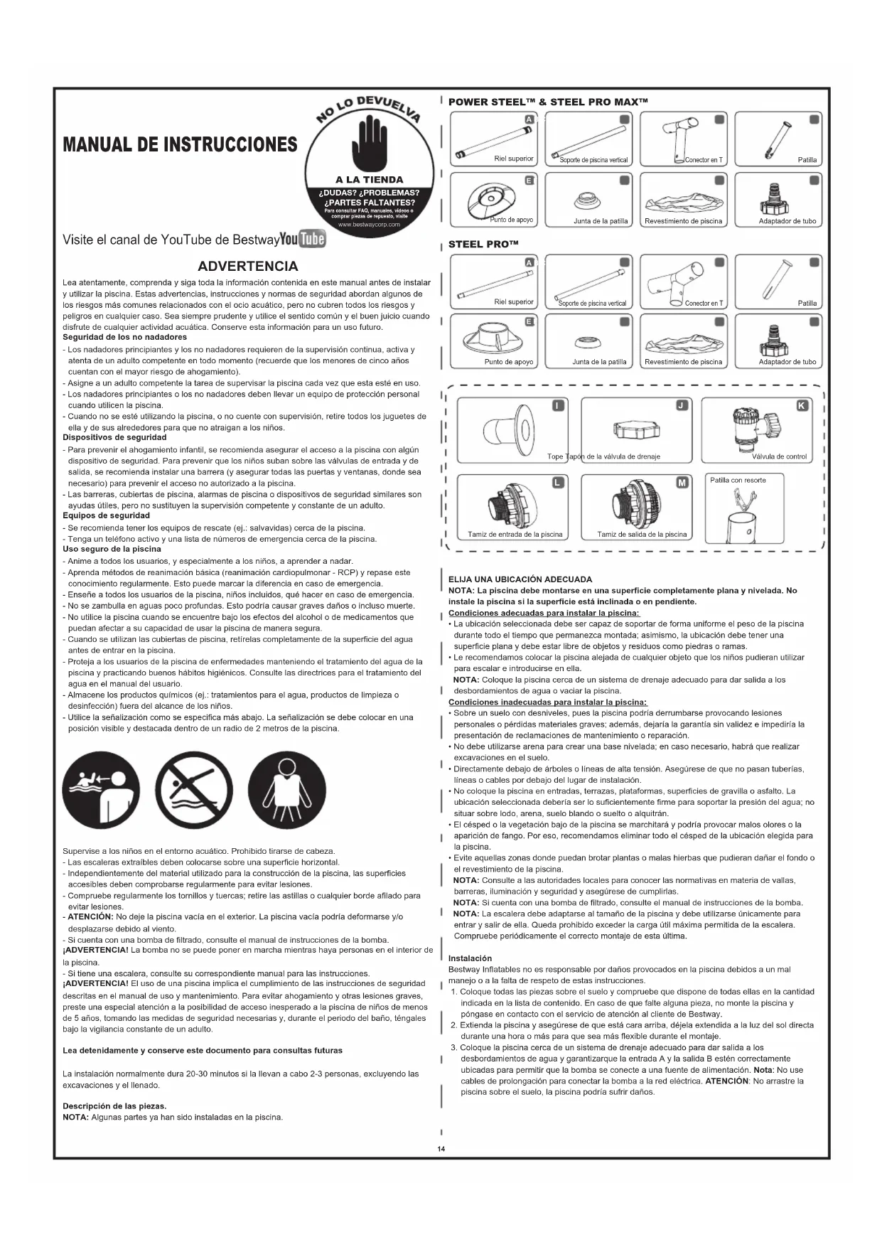 ADVERTENCIA Visite el canal de YouTube de Bestway ¿DUDAS? ¿PROBLEMAS?¿PARTES FALTANTES?Para consultar FAQ, manuales, vídeos ocomprar piezas de repuesto, visite www.bestwaycorp.com