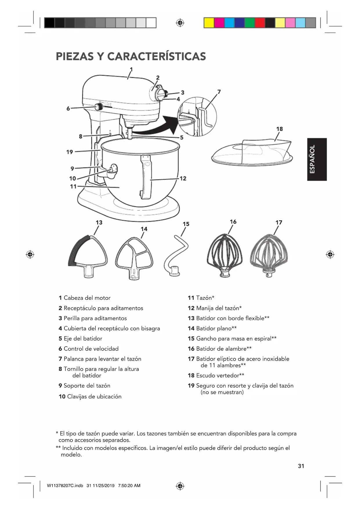 1 Cabeza del motor 2 Receptáculo para aditamentos 3 Perilla para aditamentos 4 Cubierta del receptáculo con bisagra 5 Eje del batidor 6 Control de velocidad 7 Palanca para levantar el tazón 8 Tornillo para regular la altura delbatidor 9 Soporte del tazón 10 Clavijas de ubicación 11 Tazón* 12 Manija del tazón* 13 Batidor con borde flexible** 14 Batidor plano** 15 Gancho para masa en espiral** 16 Batidor de alambre** 17 Batidor elíptico de acero inoxidable de 11 alambres** 18 Escudo vertedor** 19 Seguro con resorte y clavija del tazón (no se muestran)
