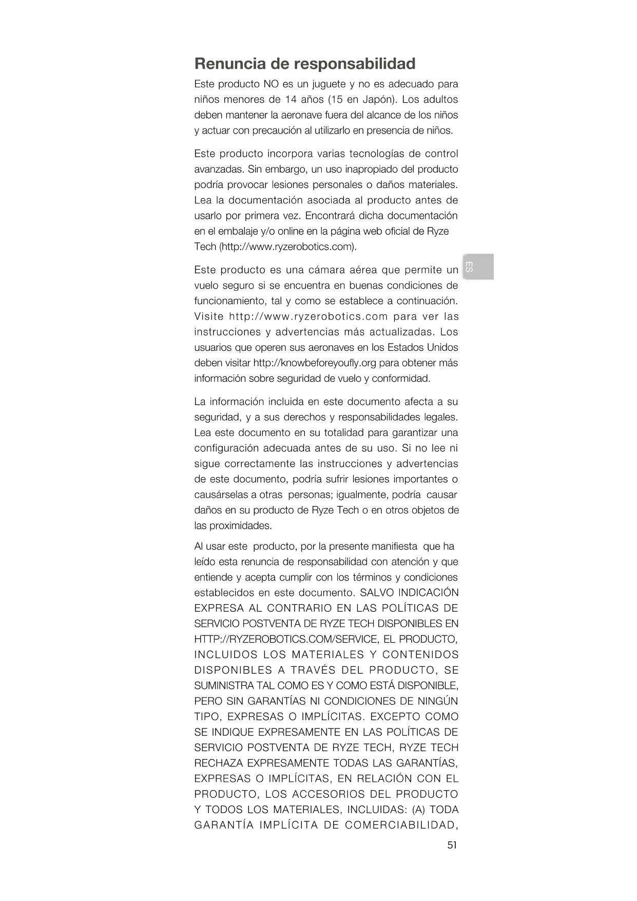 Renuncia de responsabilidad Este producto NO es un juguete y no es adecuado para niños menores de 14 años (15 en Japón). Los adultos deben mantener la aeronave fuera del alcance de los niños y actuar con precaución al utilizarlo en presencia de niños. Este producto incorpora varias tecnologías de control avanzadas. Sin embargo, un uso inapropiado del producto podría provocar lesiones personales o daños materiales. Lea la documentación asociada al producto antes de usarlo por primera vez. Encontrará dicha documentación en el embalaje y/o online en la página web ocial de Ryze Tech (http://www.ryzerobotics.com). Este producto es una cámara aérea que permite un vuelo seguro si se encuentra en buenas condiciones de funcionamiento, tal y como se establece a continuación. Visite http://www.ryzerobotics.com para ver las instrucciones y advertencias más actualizadas. Los usuarios que operen sus aeronaves en los Estados Unidos deben visitar http://knowbeforeyouy.org para obtener más información sobre seguridad de vuelo y conformidad. La información incluida en este documento afecta a su seguridad, y a sus derechos y responsabilidades legales. Lea este documento en su totalidad para garantizar una configuración adecuada antes de su uso. Si no lee ni sigue correctamente las instrucciones y advertencias de este documento, podría sufrir lesiones importantes o causárselas a otras personas; igualmente, podría causar daños en su producto de Ryze Tech o en otros objetos de las proximidades. Al usar este producto, por la presente maniesta que ha leído esta renuncia de responsabilidad con atención y que entiende y acepta cumplir con los términos y condiciones establecidos en este documento. SALVO INDICACIÓN EXPRESA AL CONTRARIO EN LAS POLÍTICAS DE SERVICIO POSTVENTA DE RYZE TECH DISPONIBLES EN HTTP://RYZEROBOTICS.COM/SERVICE, EL PRODUCTO,