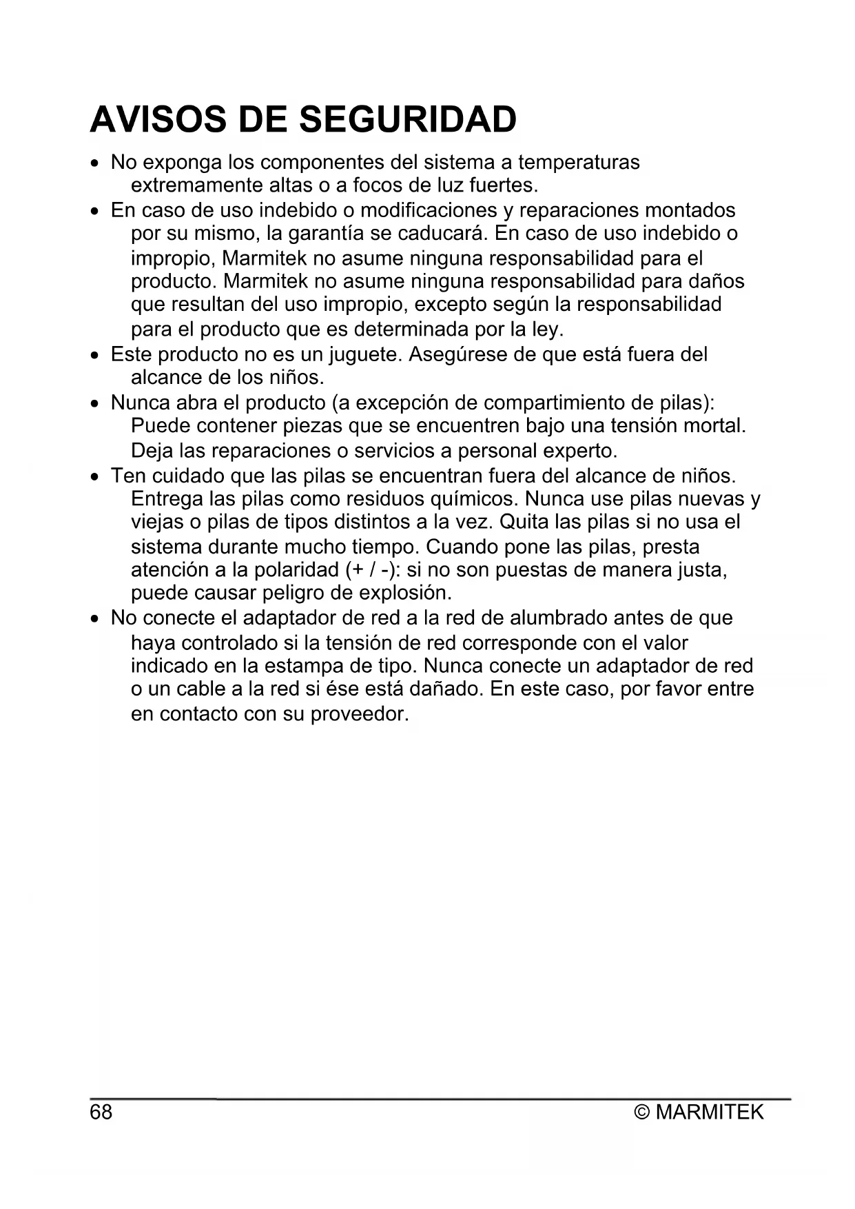 x No exponga los componentes del sistema a temperaturas extremamente altas o a focos de luz fuertes. x En caso de uso indebido o modificaciones y reparaciones montados por su mismo, la garantía se caducará. En caso de uso indebido o impropio, Marmitek no asume ninguna responsabilidad para el producto. Marmitek no asume ninguna responsabilidad para daños que resultan del uso impropio, excepto según la responsabilidad para el producto que es determinada por la ley. x Este producto no es un juguete. Asegúrese de que está fuera del alcance de los niños. x Nunca abra el producto (a excepción de compartimiento de pilas): Puede contener piezas que se encuentren bajo una tensión mortal. Deja las reparaciones o servicios a personal experto. x Ten cuidado que las pilas se encuentran fuera del alcance de niños. Entrega las pilas como residuos químicos. Nunca use pilas nuevas y viejas o pilas de tipos distintos a la vez. Quita las pilas si no usa el sistema durante mucho tiempo. Cuando pone las pilas, presta atención a la polaridad (+ / -): si no son puestas de manera justa, puede causar peligro de explosión. x No conecte el adaptador de red a la red de alumbrado antes de que haya controlado si la tensión de red corresponde con el valor indicado en la estampa de tipo. Nunca conecte un adaptador de red o un cable a la red si ése está dañado. En este caso, por favor entre en contacto con su proveedor.DoorPhone 170