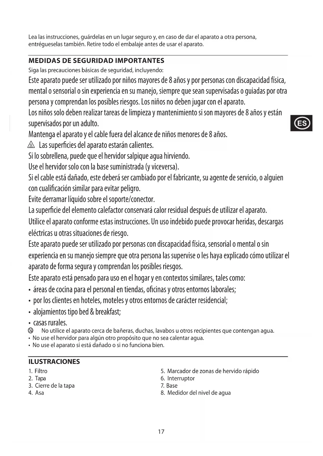 Siga las precauciones básicas de seguridad, incluyendo: Este aparato puede ser utilizado por niños mayores de 8 años y por personas con discapacidad física, mental o sensorial o sin experiencia en su manejo, siempre que sean supervisadas o guiadas por otra persona y comprendan los posibles riesgos. Los niños no deben jugar con el aparato. Los niños solo deben realizar tareas de limpieza y mantenimiento si son mayores de 8 años y están supervisados por un adulto. Mantenga el aparato y el cable fuera del alcance de niños menores de 8 años. h Las supercies del aparato estarán calientes. Si lo sobrellena, puede que el hervidor salpique agua hirviendo. Use el hervidor solo con la base suministrada (y viceversa). Si el cable está dañado, este deberá ser cambiado por el fabricante, su agente de servicio, o alguien con cualicación similar para evitar peligro. Evite derramar líquido sobre el soporte/conector. La supercie del elemento calefactor conservará calor residual después de utilizar el aparato. Utilice el aparato conforme estas instrucciones. Un uso indebido puede provocar heridas, descargas eléctricas u otras situaciones de riesgo. Este aparato puede ser utilizado por personas con discapacidad física, sensorial o mental o sin experiencia en su manejo siempre que otra persona las supervise o les haya explicado cómo utilizar el aparato de forma segura y comprendan los posibles riesgos. Este aparato está pensado para uso en el hogar y en contextos similares, tales como:
