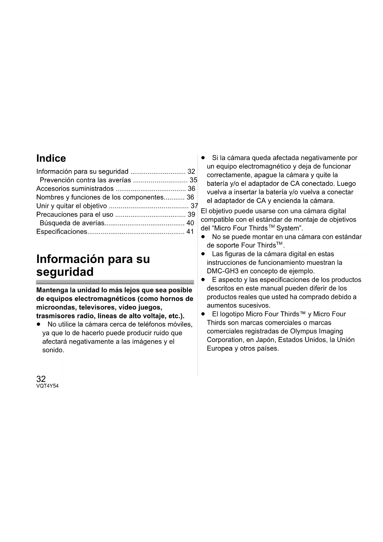 ≥ Las figuras de la cámara digital en estas instrucciones de funcionamiento muestran la DMC-GH3 en concepto de ejemplo. ≥ E aspecto y las especificaciones de los productos descritos en este manual pueden diferir de los productos reales que usted ha comprado debido a aumentos sucesivos. ≥ El logotipo Micro Four Thirds™ y Micro Four Thirds son marcas comerciales o marcas comerciales registradas de Olympus Imaging Corporation, en Japón, Estados Unidos, la Unión Europea y otros países. VQT4Y54_E.book 32 ページ 2013年4月12日 金曜日 午後2時2分33 VQT4Y54 ≥ El logotipo Four Thirds™ y Four Thirds son marcas comerciales o marcas comerciales registradas de Olympus Imaging Corporation, en Japón, Estados Unidos, la Unión Europea y otros países.