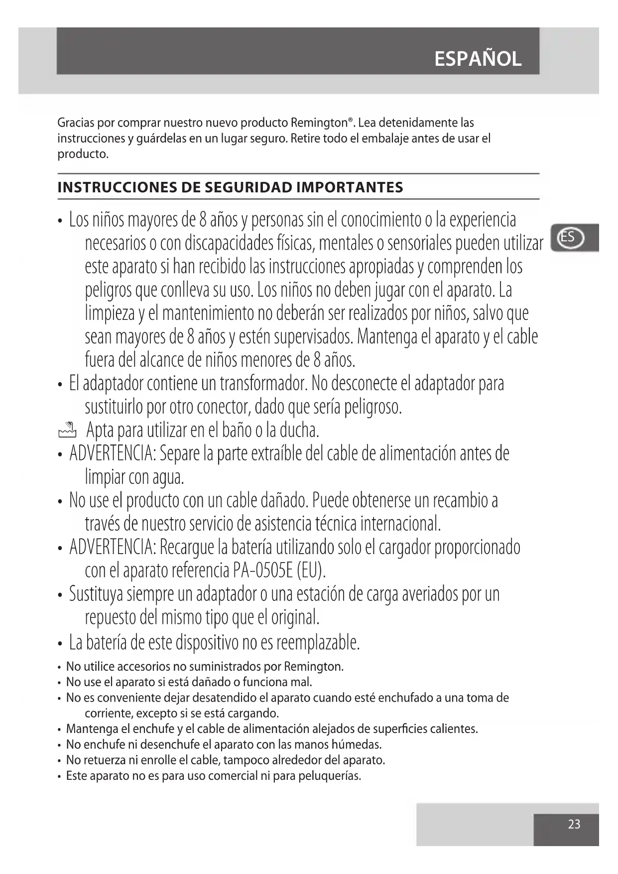 - No utilice accesorios no suministrados por Remington. • No use el aparato si está dañado o funciona mal.• No es conveniente dejar desatendido el aparato cuando esté enchufado a una toma de corriente, excepto si se está cargando.• Mantenga el enchufe y el cable de alimentación alejados de supercies calientes.• No enchufe ni desenchufe el aparato con las manos húmedas.• No retuerza ni enrolle el cable, tampoco alrededor del aparato.• Este aparato no es para uso comercial ni para peluquerías. ESPAÑOL