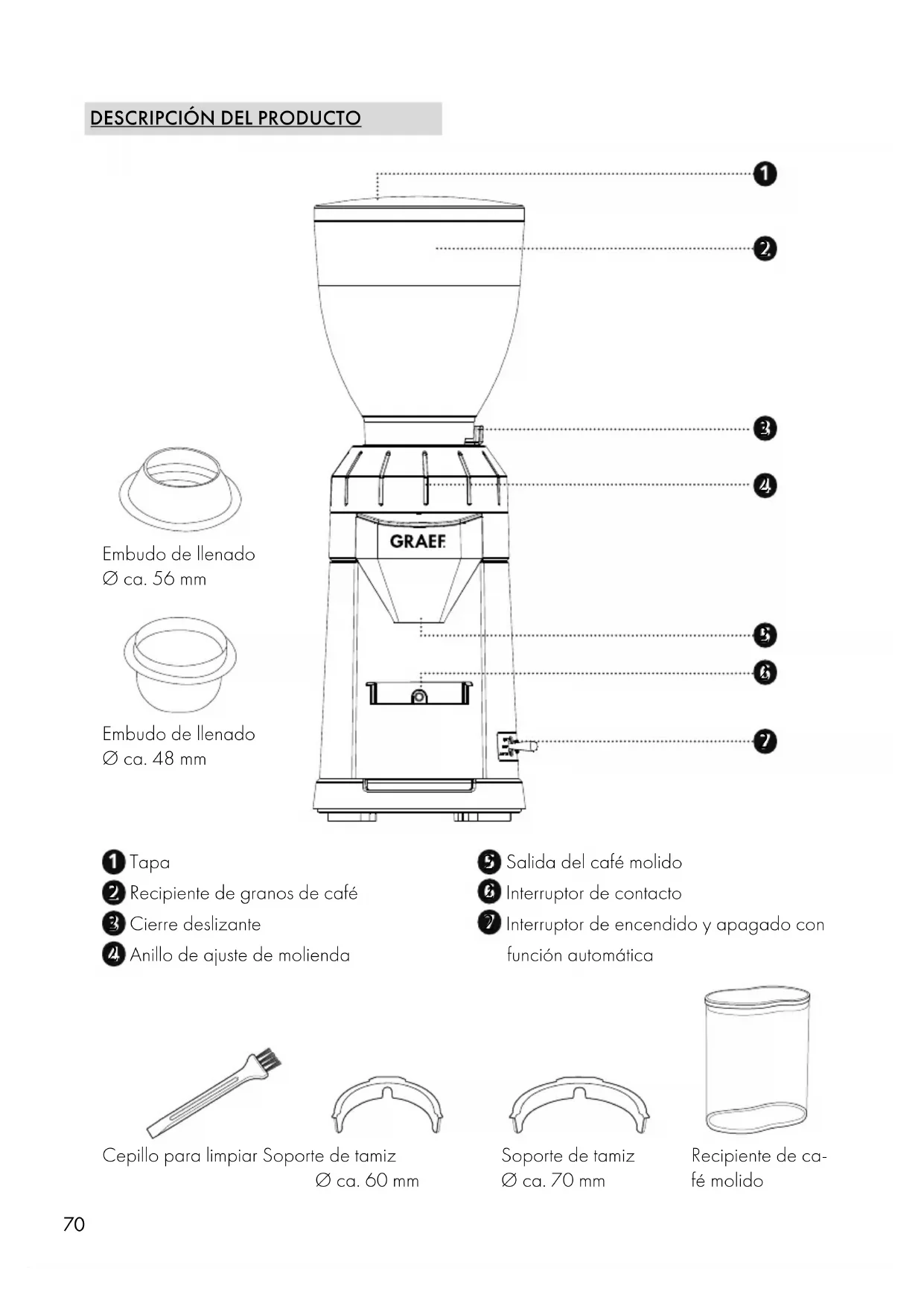 Cepillo para limpiar Soporte de tamiz Ø ca. 60 mm Soporte de tamiz Ø ca. 70 mm Recipiente de ca- fé molido Embudo de llenado Ø ca. 56 mm Embudo de llenado Ø ca. 48 mm71