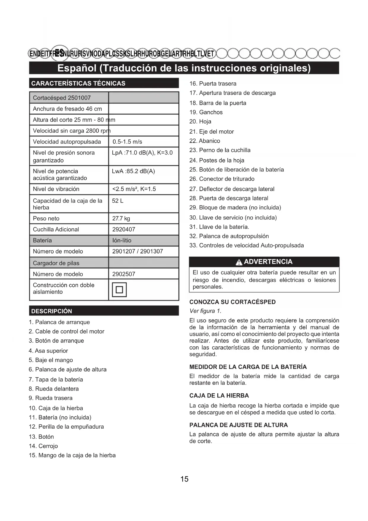 EN DE IT FR PT NL RU FI SV NO DA PL CS SK SL HR HU RO BG EL AR TR HE LT LV ET CARACTERÍSTICAS TÉCNICASCortacésped 2501007Anchura de fresado 46 cmAltura del corte 25 mm - 80 mmVelocidad sin carga 2800 rpmVelocidad autopropulsada 0.5-1.5 m/sNivel de presión sonora garantizadoLpA :71.0 dB(A), K=3.0Nivel de potenciaacústica garantizadoLwA :85.2 dB(A)Nivel de vibración <2.5 m/s², K=1.5Capacidad de la caja de la hierba 52 L Peso neto 27.7 kg Cuchilla Adicional 2920407Batería Ión-litioNúmero de modelo 2901207 / 2901307Cargador de pilasNúmero de modelo 2902507Construcción con doble aislamientoDESCRIPCIÓN1. Palanca de arranque2. Cable de control del motor3. Botón de arranque4. Asa superior5. Baje el mango6. Palanca de ajuste de altura7. Tapa de la batería8. Rueda delantera9. Rueda trasera10. Caja de la hierba11. Batería (no incluida)12. Perilla de la empuñadura13. Botón14. Cerrojo15. Mango de la caja de la hierba16. Puerta trasera17. Apertura trasera de descarga18. Barra de la puerta19. Ganchos20. Hoja21. Eje del motor22. Abanico23. Perno de la cuchilla24. Postes de la hoja25. Botón de liberación de la batería26. Conector de triturado27. Deflector de descarga lateral28. Puerta de descarga lateral29. Bloque de madera (no incluida)30. Llave de servicio (no incluida)31. Llave de la batería.32. Palanca de autopropulsión 33. Controles de velocidad Auto-propulsada ADVERTENCIA El uso de cualquier otra batería puede resultar en un riesgo de incendio, descargas eléctricas o lesiones personales. CONOZCA SU CORTACÉSPEDVer gura 1.El uso seguro de este producto requiere la comprensión de la información de la herramienta y del manual de usuario, así como el conocimiento del proyecto que intenta realizar. Antes de utilizar este producto, familiarícese con las características de funcionamiento y normas de seguridad.MEDIDOR DE LA CARGA DE LA BATERÍAEl medidor de la batería mide la cantidad de carga restante en la batería.CAJA DE LA HIERBALa caja de hierba recoge la hierba cortada e impide que se descargue en el césped a medida que usted lo corta.PALANCA DE AJUSTE DE ALTURALa palanca de ajuste de altura permite ajustar la altura de corte. 15Español (Traducción de las instrucciones originales)