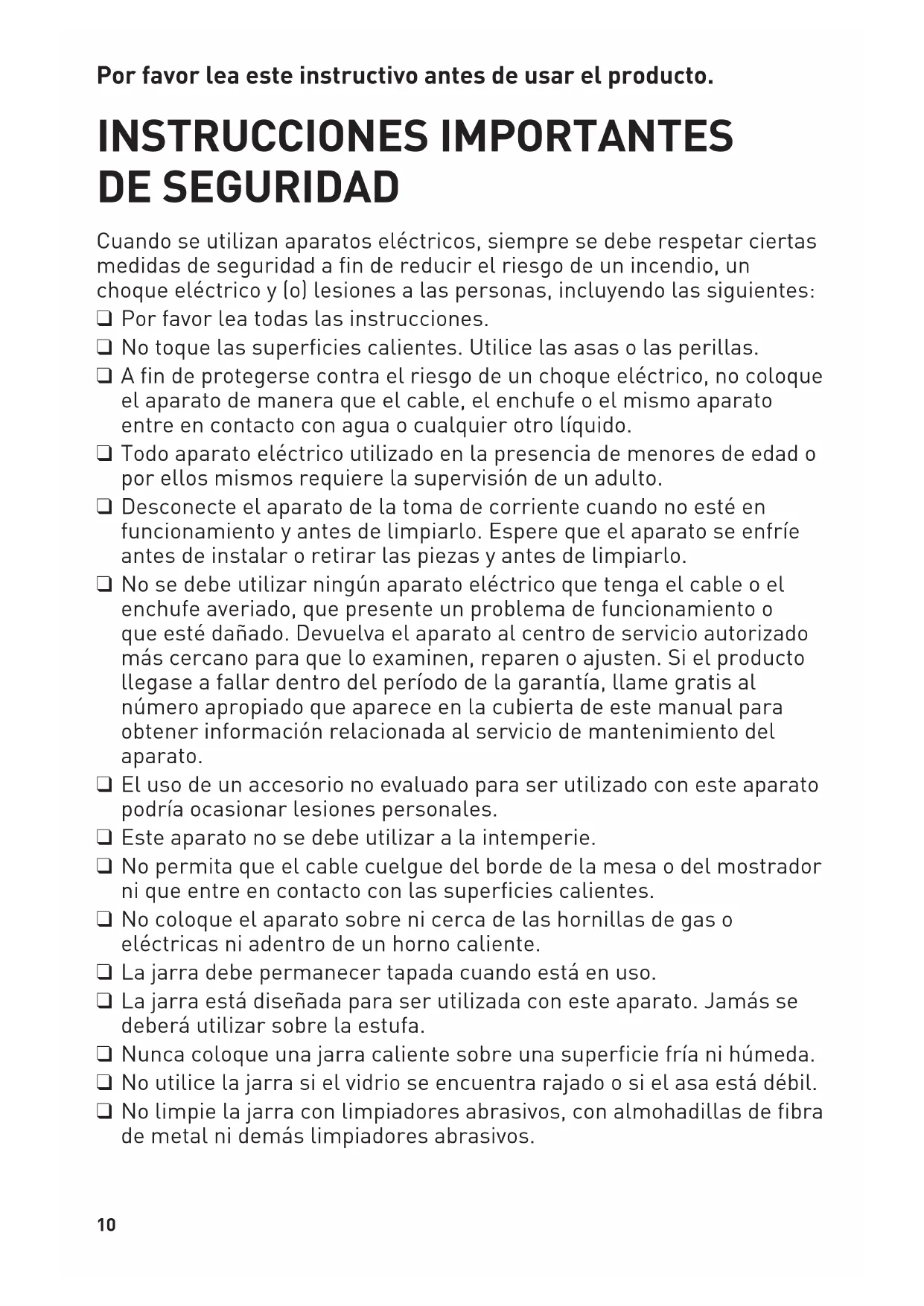 the cover of the coffeemaker. There are no user-serviceable parts inside. Repair should be done by authorized service personnel only.10 Por favor lea este instructivo antes de usar el producto. INSTRUCCIONES IMPORTANTES DE SEGURIDAD Cuando se utilizan aparatos eléctricos, siempre se debe respetar ciertas medidas de seguridad a fin de reducir el riesgo de un incendio, un choque eléctrico y (o) lesiones a las personas, incluyendo las siguientes: