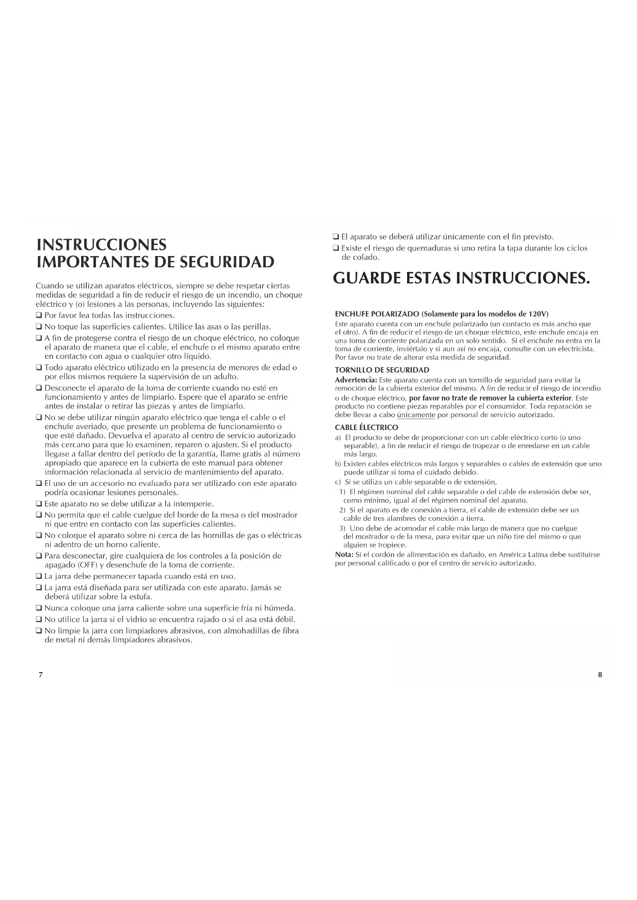 del mostrador o de la mesa, para evitar que un niño tire del mismo o que alguien se tropiece. Nota: Si el cordón de alimentación es dañado, en América Latina debe sustituirse por personal calificado o por el centro de servicio autorizado. Cuando se utilizan aparatos eléctricos, siempre se debe respetar ciertas medidas de seguridad a fin de reducir el riesgo de un incendio, un choque eléctrico y (o) lesiones a las personas, incluyendo las siguientes: q Por favor lea todas las instrucciones. q No toque las superficies calientes. Utilice las asas o las perillas. q A fin de protegerse contra el riesgo de un choque eléctrico, no coloque el aparato de manera que el cable, el enchufe o el mismo aparato entre en contacto con agua o cualquier otro líquido. q Todo aparato eléctrico utilizado en la presencia de menores de edad o por ellos mismos requiere la supervisión de un adulto. q Desconecte el aparato de la toma de corriente cuando no esté en funcionamiento y antes de limpiarlo. Espere que el aparato se enfríe antes de instalar o retirar las piezas y antes de limpiarlo. q No se debe utilizar ningún aparato eléctrico que tenga el cable o el enchufe averiado, que presente un problema de funcionamiento o que esté dañado. Devuelva el aparato al centro de servicio autorizado más cercano para que lo examinen, reparen o ajusten. Si el producto llegase a fallar dentro del período de la garantía, llame gratis al número apropiado que aparece en la cubierta de este manual para obtener información relacionada al servicio de mantenimiento del aparato. q El uso de un accesorio no evaluado para ser utilizado con este aparato podría ocasionar lesiones personales. q Este aparato no se debe utilizar a la intemperie. q No permita que el cable cuelgue del borde de la mesa o del mostrador ni que entre en contacto con las superficies calientes. q No coloque el aparato sobre ni cerca de las hornillas de gas o eléctricas ni adentro de un horno caliente. q Para desconectar, gire cualquiera de los controles a la posición de apagado (OFF) y desenchufe de la toma de corriente. q La jarra debe permanecer tapada cuando está en uso. q La jarra está diseñada para ser utilizada con este aparato. Jamás se deberá utilizar sobre la estufa. q Nunca coloque una jarra caliente sobre una superficie fría ni húmeda. q No utilice la jarra si el vidrio se encuentra rajado o si el asa está débil. q No limpie la jarra con limpiadores abrasivos, con almohadillas de fibra de metal ni demás limpiadores abrasivos. INSTRUCCIONES
