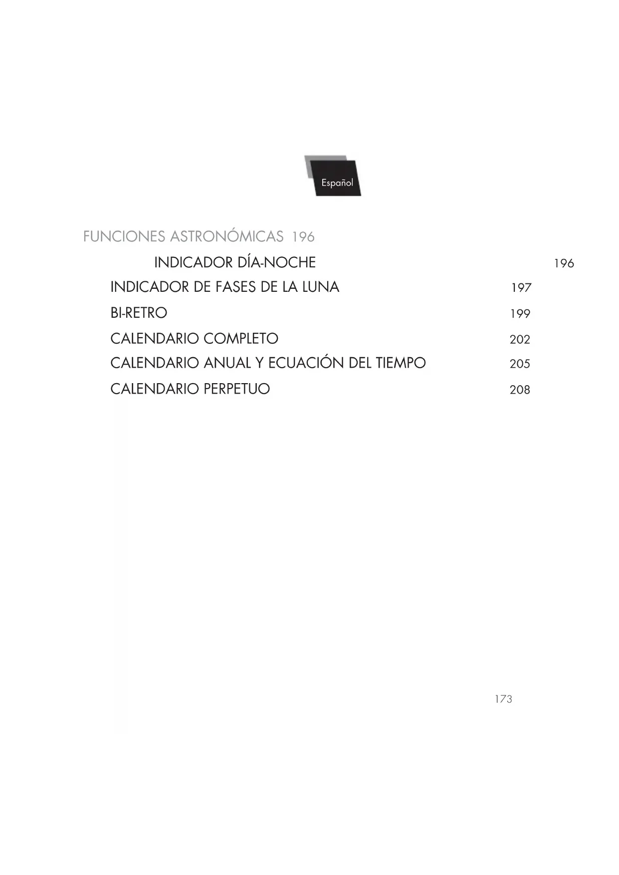 La indicación día-noche permite reproducir, mediante un sistema de disco que representa el Sol y la Luna, la indicación del día y de la noche. En la ventanilla especial de lacke se ve una representación del cielo,onde se muestran las formas de la Luna y del Sol según prograsa el dia.