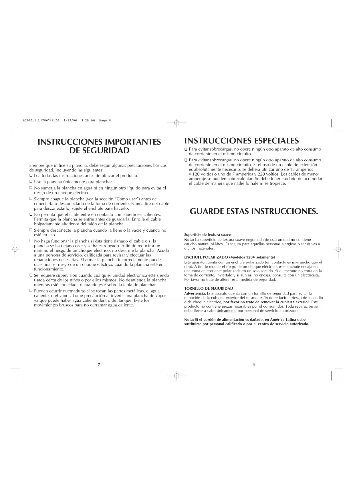 Pueden ocurrir quemaduras si se tocan las partes metálicas, el agua caliente, o el vapor. Tome precaución al invertir una plancha de vapor ya que puede haber agua caliente dentro del tanque. Evite los movimientos bruscos para no derramar agua caliente. GUARDE ESTAS INSTRUCCIONES. Superficie de textura suave Nota: La superficie de textura suave engomada de esta unidad no contiene caucho natural ni látex. Es segura para aquellas personas alérgicas o sensitivas a dichos materiales. ENCHUFE POLARIZADO (Modelos 120V solamente) Este aparato cuenta con un enchufe polarizado (un contacto es más ancho que el otro). A fin de reducir el riesgo de un choque eléctrico, este enchufe encaja en una toma de corriente polarizada en un solo sentido. Si el enchufe no entra en la toma de corriente, inviértalo y si aun así no encaja, consulte con un electricista. Por favor no trate de alterar esta medida de seguridad.