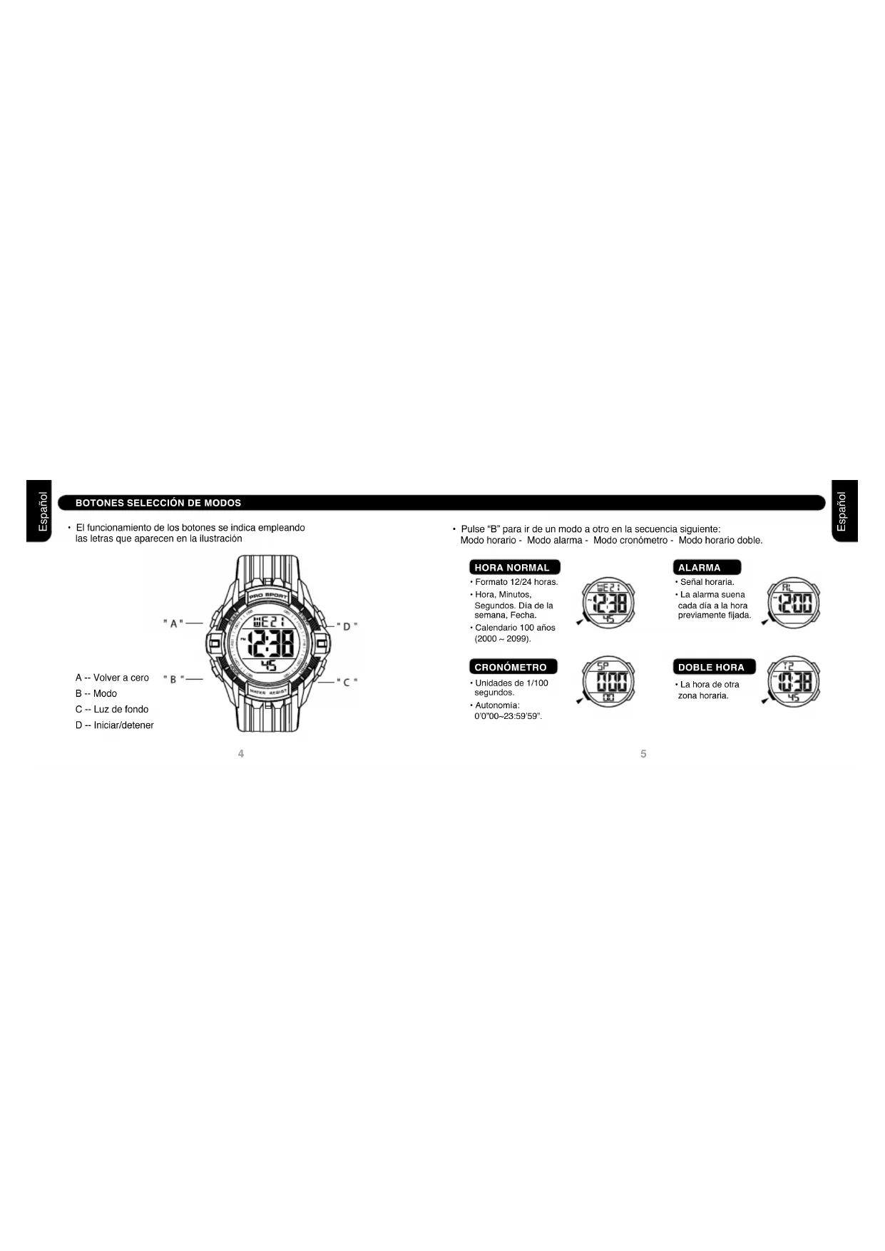 - En modo horario normal, mantenga pulsado “D” para visualizar año, mes y fecha8 9 Español Español CRONÓMETROALARMA Alarma y señal sonora