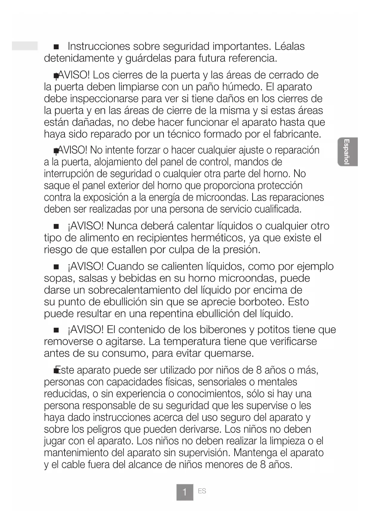 ¡AVISO! No intente forzar o hacer cualquier ajuste o reparación a la puerta, alojamiento del panel de control, mandos de interrupción de seguridad o cualquier otra parte del horno. No saque el panel exterior del horno que proporciona protección contra la exposición a la energía de microondas. Las reparaciones deben ser realizadas por una persona de servicio cualificada. ¡AVISO! Nunca deberá calentar líquidos o cualquier otro tipo de alimento en recipientes herméticos, ya que existe el riesgo de que estallen por culpa de la presión. ¡AVISO! Cuando se calienten líquidos, como por ejemplo sopas, salsas y bebidas en su horno microondas, puede darse un sobrecalentamiento del líquido por encima de su punto de ebullición sin que se aprecie borboteo. Esto puede resultar en una repentina ebullición del líquido. ¡AVISO! El contenido de los biberones y potitos tiene que removerse o agitarse. La temperatura tiene que verificarse antes de su consumo, para evitar quemarse.