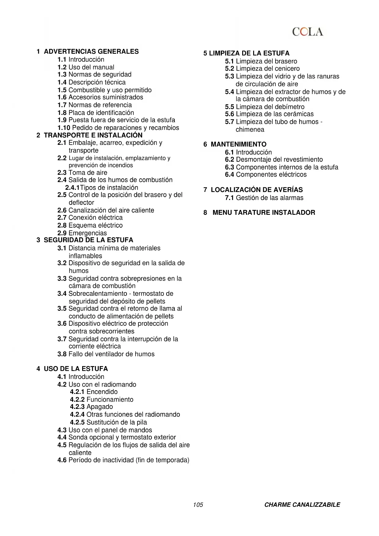 Pararialk mntimio y limpiea de fin de temporada, COLA S.r.l. aconsejllamar a un Centro de asistencia autorizo, cui personal also n conrolar el desgaste de los componentes internos de la estufa.