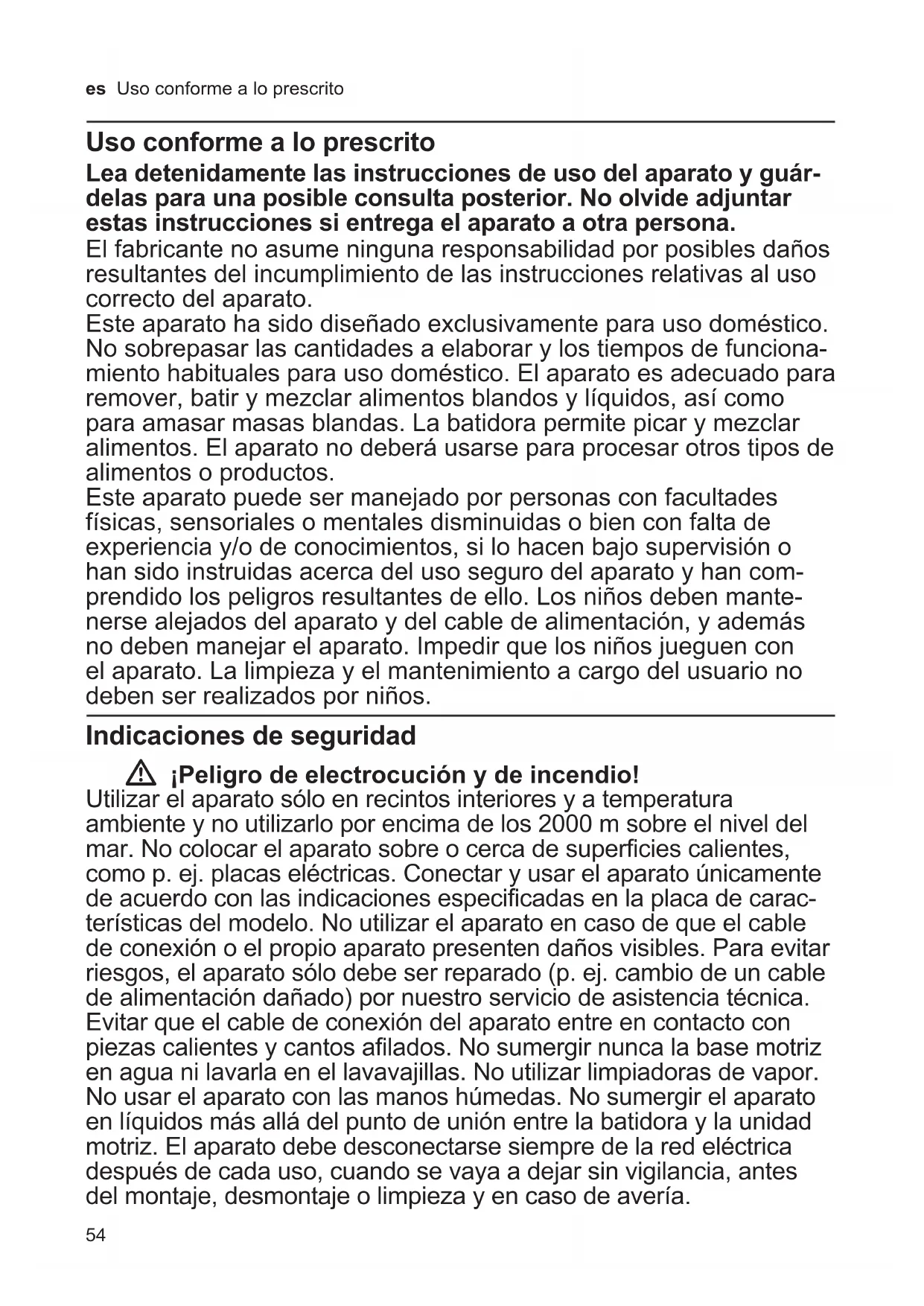 - Hävitä pakkaus ympäristöystäväl- lisesti. Tämän laitteen merkintä perustuu käytettyjä sähkö- ja elektroniikkalaitteita (waste electrical and electronic equipment – WEEE) koskevaan direktiiviin 2012/19/EU. Tämä direktiivi määrittää käytettyjen laitteiden palautus- ja kierrätys-sään- nökset koko EU:n alueella. Tietoja oikeasta jätehuollosta saa myyjältä tai kunnalliselta jäteneuvojalta. Takuu Tälle laitteelle ovat voimassa maahantuojan myöntämät takuuehdot. Täydelliset takuue- hdot saat myyntiliikkeeltä, josta olet ostanut laitteen. Takuutapauksessa on näytettävä ostokuitti. Oikeus muutoksiin pidätetään.54 es Uso conforme a lo prescrito Uso conforme a lo prescrito Lea detenidamente las instrucciones de uso del aparato y guár- delas para una posible consulta posterior. No olvide adjuntar estas instrucciones si entrega el aparato a otra persona. El fabricante no asume ninguna responsabilidad por posibles daños resultantes del incumplimiento de las instrucciones relativas al uso correcto del aparato. Este aparato ha sido diseñado exclusivamente para uso doméstico. No sobrepasar las cantidades a elaborar y los tiempos de funciona- miento habituales para uso doméstico. El aparato es adecuado para remover, batir y mezclar alimentos blandos y líquidos, así como para amasar masas blandas. La batidora permite picar y mezclar alimentos. El aparato no deberá usarse para procesar otros tipos de alimentos o productos. Este aparato puede ser manejado por personas con facultades físicas, sensoriales o mentales disminuidas o bien con falta de experiencia y/o de conocimientos, si lo hacen bajo supervisión o han sido instruidas acerca del uso seguro del aparato y han com- prendido los peligros resultantes de ello. Los niños deben mante- nerse alejados del aparato y del cable de alimentación, y además no deben manejar el aparato. Impedir que los niños jueguen con el aparato. La limpieza y el mantenimiento a cargo del usuario no deben ser realizados por niños. Indicaciones de seguridad W ¡Peligro de electrocución y de incendio! Utilizar el aparato sólo en recintos interiores y a temperatura ambiente y no utilizarlo por encima de los 2000 m sobre el nivel del mar. No colocar el aparato sobre o cerca de superficies calientes, como p. ej. placas eléctricas. Conectar y usar el aparato únicamente de acuerdo con las indicaciones especificadas en la placa de carac- terísticas del modelo. No utilizar el aparato en caso de que el cable de conexión o el propio aparato presenten daños visibles. Para evitar riesgos, el aparato sólo debe ser reparado (p. ej. cambio de un cable de alimentación dañado) por nuestro servicio de asistencia técnica. Evitar que el cable de conexión del aparato entre en contacto con piezas calientes y cantos afilados. No sumergir nunca la base motriz en agua ni lavarla en el lavavajillas. No utilizar limpiadoras de vapor. No usar el aparato con las manos húmedas. No sumergir el aparato en líquidos más allá del punto de unión entre la batidora y la unidad motriz. El aparato debe desconectarse siempre de la red eléctrica después de cada uso, cuando se vaya a dejar sin vigilancia, antes del montaje, desmontaje o limpieza y en caso de avería.55 es Indicaciones de seguridad W ¡Peligro de lesiones! No conectar nunca el aparato a temporizadores ni enchufes teledirigi- dos. En caso de interrupción del suministro de corriente, el aparato permanece conectado y vuelve a arrancar tras restablecerse la ali- mentación de corriente. Desconectar el aparato inmediatamente. ¡Vigilar siempre el aparato mientras esté funcionando! Se aconseja dejar el aparato conectado sólo el tiempo absolutamente indispensa- ble para elaborar los alimentos. Después de utilizar el aparato, esperar a que el accionamiento se detenga. Antes de cambiar acce- sorios o piezas adicionales que se muevan durante el servicio, apagar el aparato y desconectarlo de la red eléctrica. Montar y des- montar los accesorios sólo con el aparato completamente parado – el aparato sigue funcionando durante un breve tiempo tras desconec- tarlo. No usar el aparato en seco, sin alimentos. No agarrar nunca las piezas giratorias. No introducir nunca las manos en el pie de la bati- dora. No limpiar nunca la cuchilla sujetándola con las manos: Utilizar siempre un cepillo. Proteger o recoger los cabellos largos o la ropa suelta a fin de que no sean atrapados por los útiles en rotación. Utili- zar el aparato sólo con piezas y accesorios originales. Utilizar sola- mente accesorios del mismo tipo (p. ej. 2 garfios amasadores) y de dos en dos. No utilizar nunca al mismo tiempo accesorios acoplados en la base motriz y en la boca posterior. W ¡Peligro de quemaduras! Prestar atención al trabajar con alimentos calientes. Al procesarlos, podrían salpicar. W ¡Importante! En caso de usar la batidora en el interior de una cacerola, retirar primero la cacerola de la zona de cocción. El vaso de la batidora no es adecuado para usarlo en el horno microondas. Es imprescin- dible limpiar el aparato de la forma indicada después de cada uso y después de que no se haya utilizado durante un tiempo prolon- gado. X «Tras concluir el trabajo / Limpieza del aparato» véase la página 5756 es Contenido Descripción del aparato Desplegar las páginas con las ilustraciones. X Figura A Base motriz 1 Tecla de desbloqueo Para extraer los accesorios 2 Interruptor de 5 velocidades + accionamiento momentáneo Para encender y apagar el aparato, así como regular la velocidad de trabajo. P = apagado 1 = velocidad mínima 5 = velocidad máxima M = accionamiento momentáneo (máxima velocidad), desplazar hacia la izquierda y mantenerlo en esta posición 3 Cable de conexión a la red 4 Boca posterior con cierre Para introducir accesorios como, p. ej. la batidora 5 Teclas de desbloqueo Para extraer los accesorios de la boca posterior. Pulsar ambas teclas simultáneamente. 6 Bocas para introducir los ac